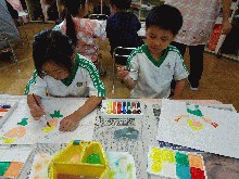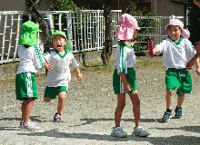10月8日(水):運動会は終わりましたが、子ども達は、今日もまだその余韻を楽しんでいました。年長は、絵の具を使って運動会の思い出の絵を描いていました。年中は、園庭でリレーごっをしました。また、年長の「きく組」と年中の「うめ組」は、お遊戯の衣装を身に付けて、入場門のアーチの前で集合写真の撮影をしました。年少の子ども達は、季節の製作活動で、毛糸を使ってケーキのモンブランの製作をしたり、スタンプでクリのイガづくりをしたりしていました。
