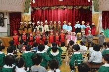 12月4日(木):今日は、2階遊戯室のステージで、りす組の子ども達が、やりとり遊び「クリスマスのさがしもの」の練習と、年少が歌と楽器遊びの練習を行った後、年中の子ども達が、生活発表会の予行練習を行いました。りす組・年少・年長の子ども達が観客となって、年中うめ組が「おばけのたまご」の歌と「ドレミのうた」の音楽遊びを、さくら組は「そうだったらいいのにな」の歌と「ミッキーマウスマーチ」の音楽遊びを披露しました。また、年中の子ども達全員で、劇遊び「さるかにばなし」をみんなに見てもらいました。