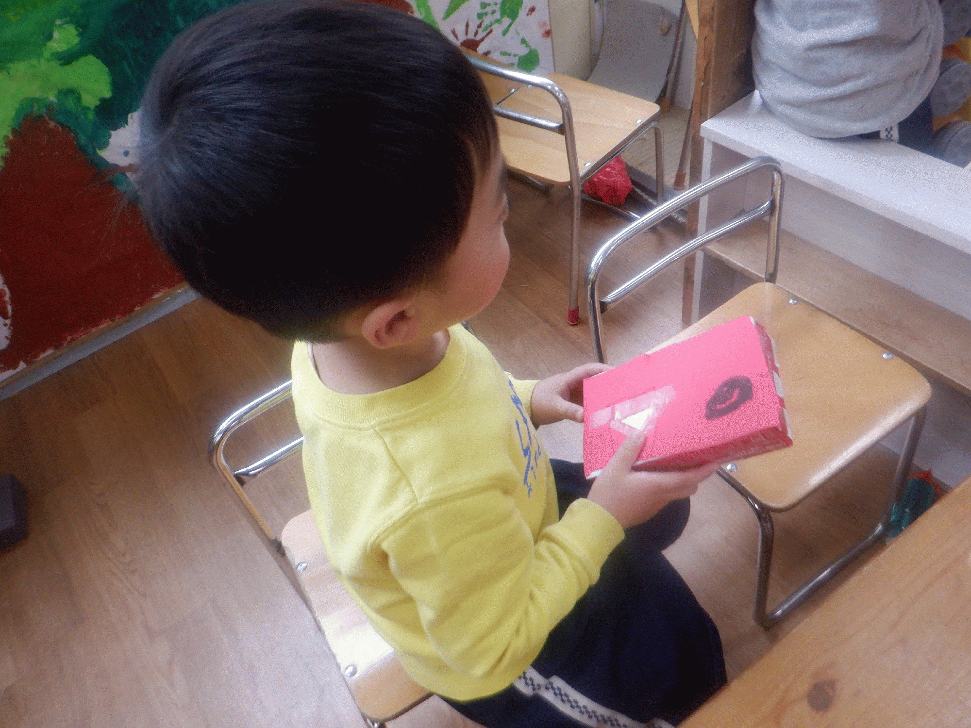 今日の室内遊びの際に子どもたちがそれぞれ夢中で製作に取り組んでいました。どんな物を作っているのか覗いてみると、、、作り方を教え合いながら折り紙でゲーム機を作っている子がいました。