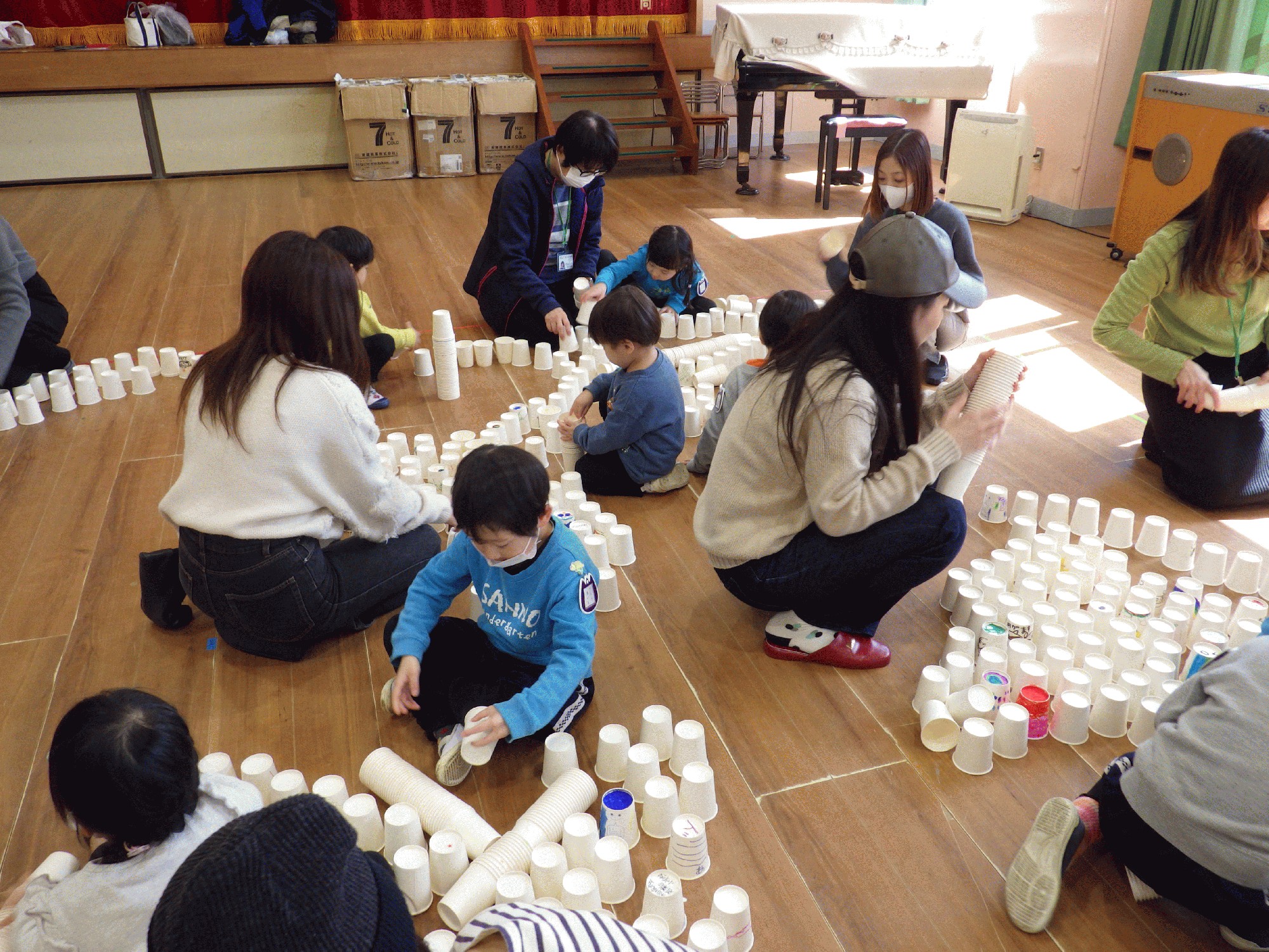 今日はアート参観がありました!今までのアートの内容とは全然違い今回は紙コップをなんと「5000個」使用して色々な遊びをしました。