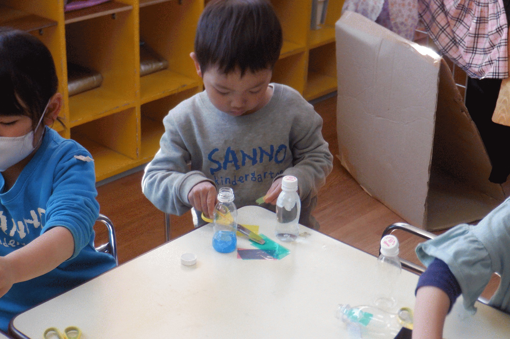 最近子ども達が興味を持っている色水遊び。花、葉っぱ、土を入れては何色になるか調べています。