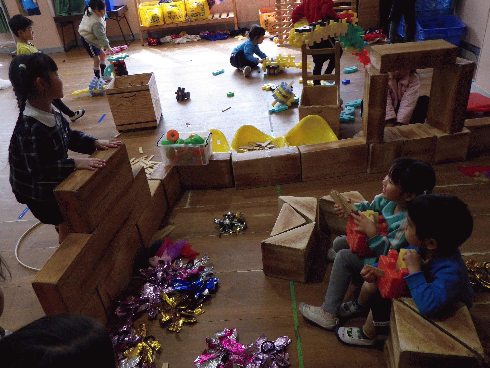 今日はホールでコーナーを作り、好きな遊びで楽しんでいました!最近のすみれ組ではお店屋さんごっこが大人気で、ホールでもアクセサリー作りや、紙皿で飛行機を作って思う存分に広い場所で伸び伸びと楽しんでいました。