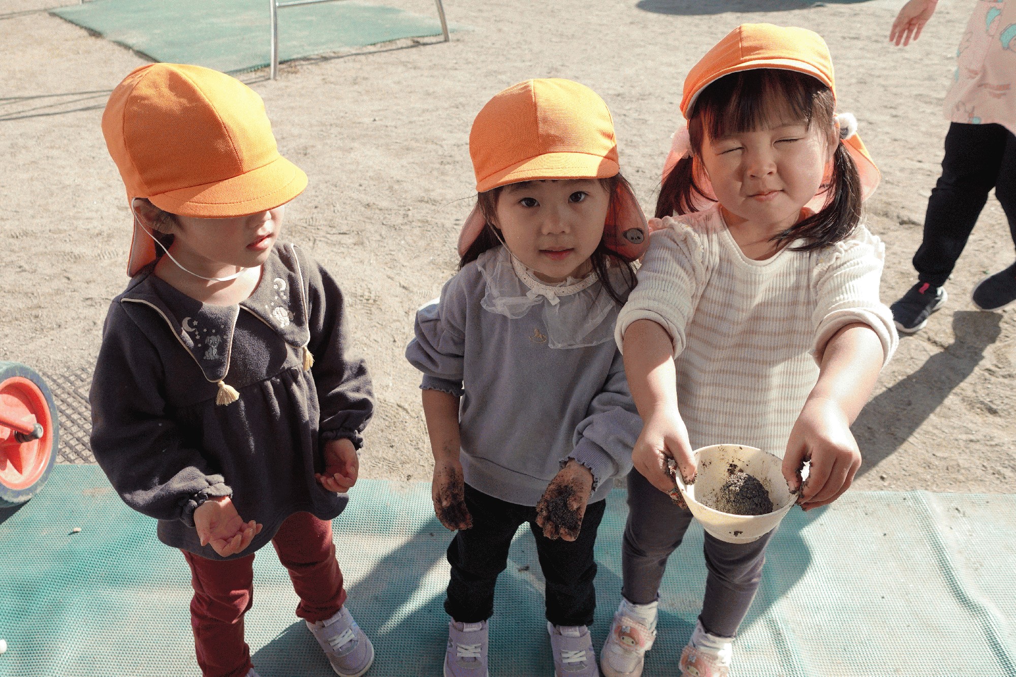 12月17日(水):りす組の子ども達は朝から園庭に出て、先日、年長の子ども達から教えてもらった泥団子づくりをしました。