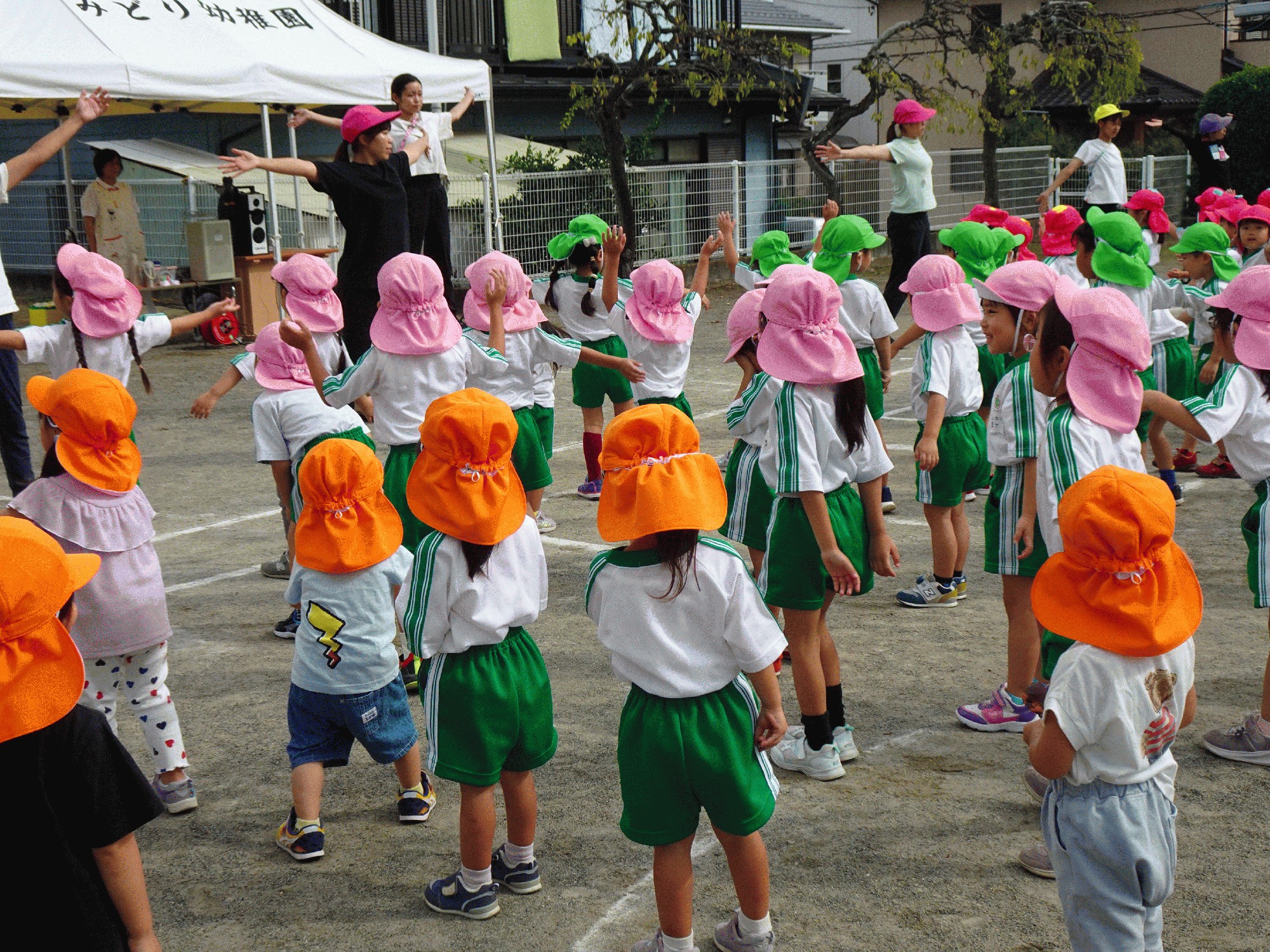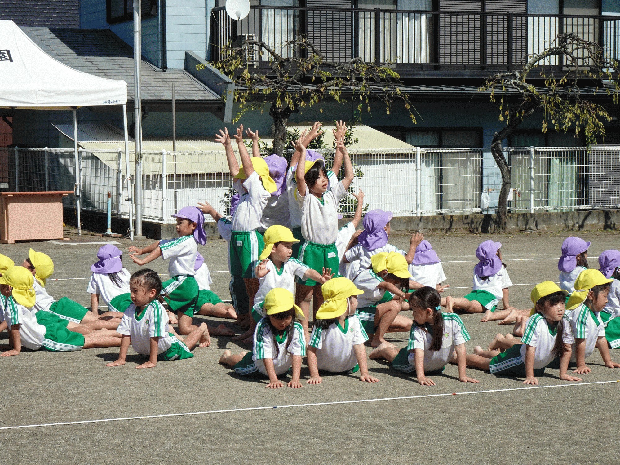 10月2日(木):今日は、運動会前最後の保育体育がありました。年長は、講師の先生に指導していただき、繰り返し「組体操」の練習をしたり、遊戯「ひらりと桜」の細かい動きを確認したりしました。