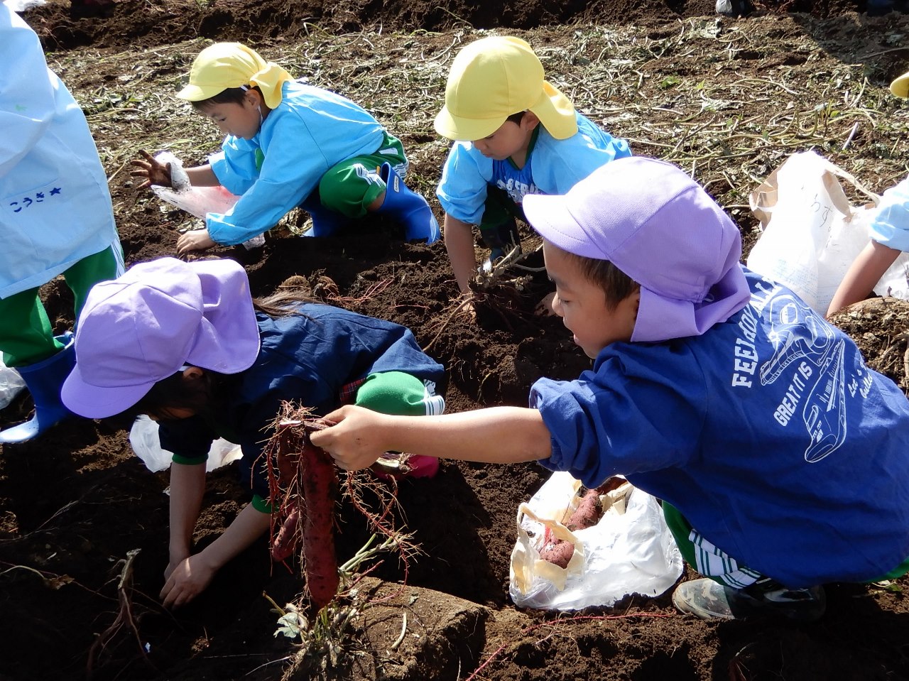 農業大学校の畑でさつま芋堀を体験しました。当日は長靴・スモック姿で登園。 芋袋を手に、いざ!