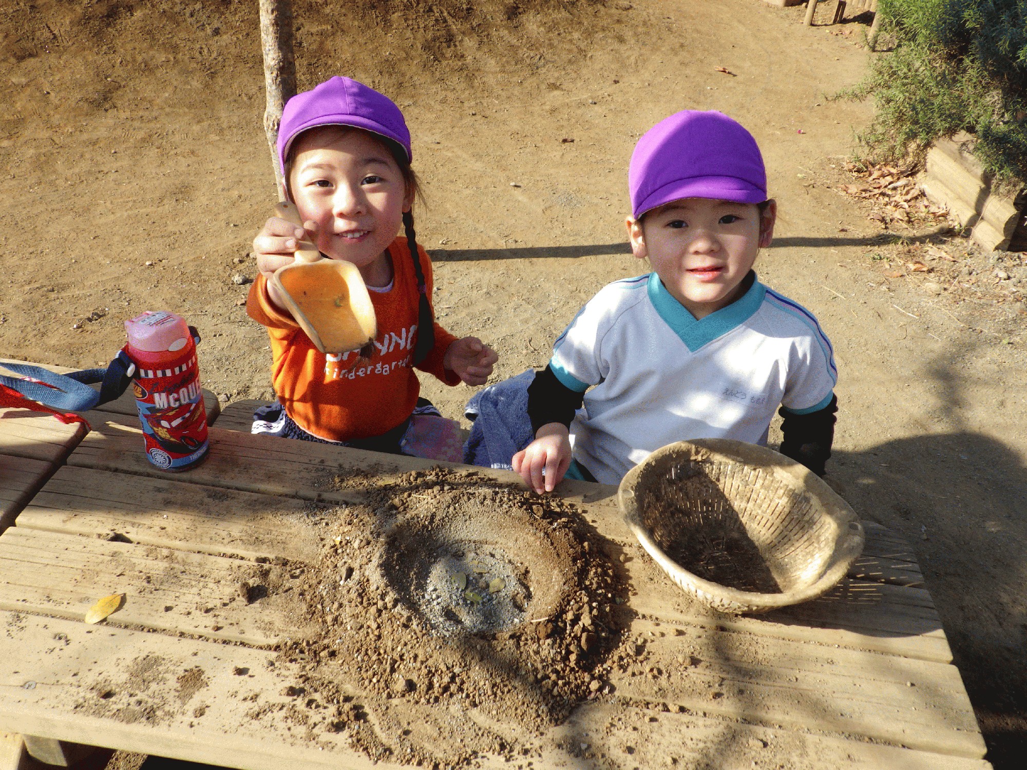 今日は砂場の道具を使っておままごとをしている子ども達が多くいました。