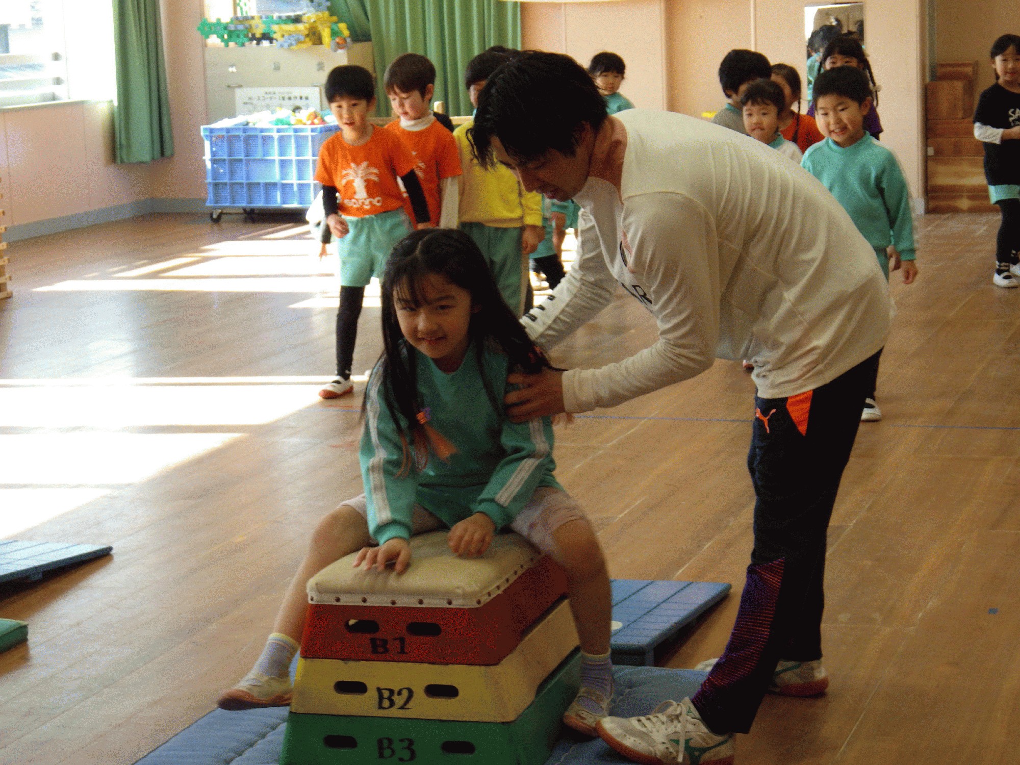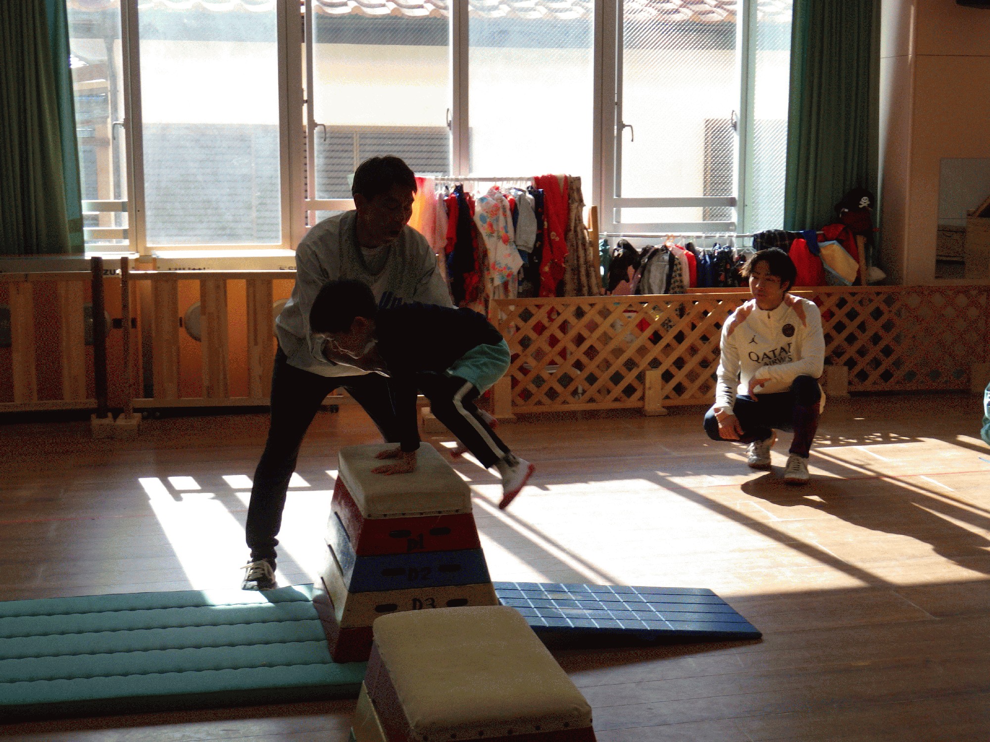以前は初めてだったということもあり、少し飛ぶのを怖がる子どももいましたが今日はみんなキラキラとした笑顔で跳び箱に挑戦をする姿がありました!