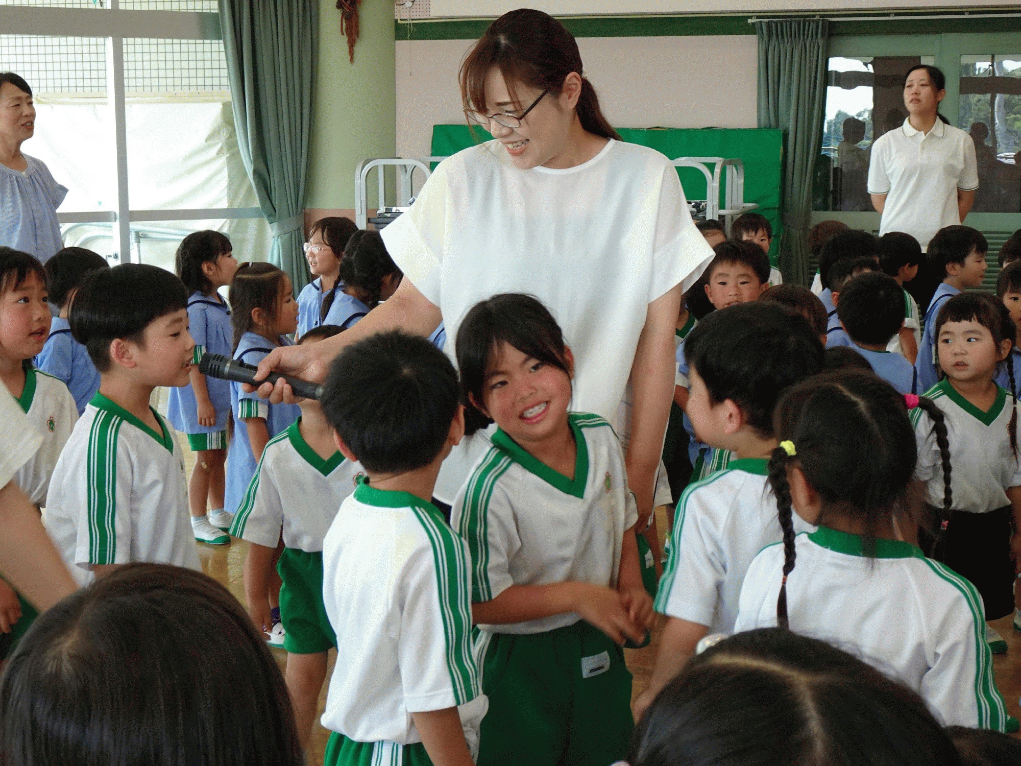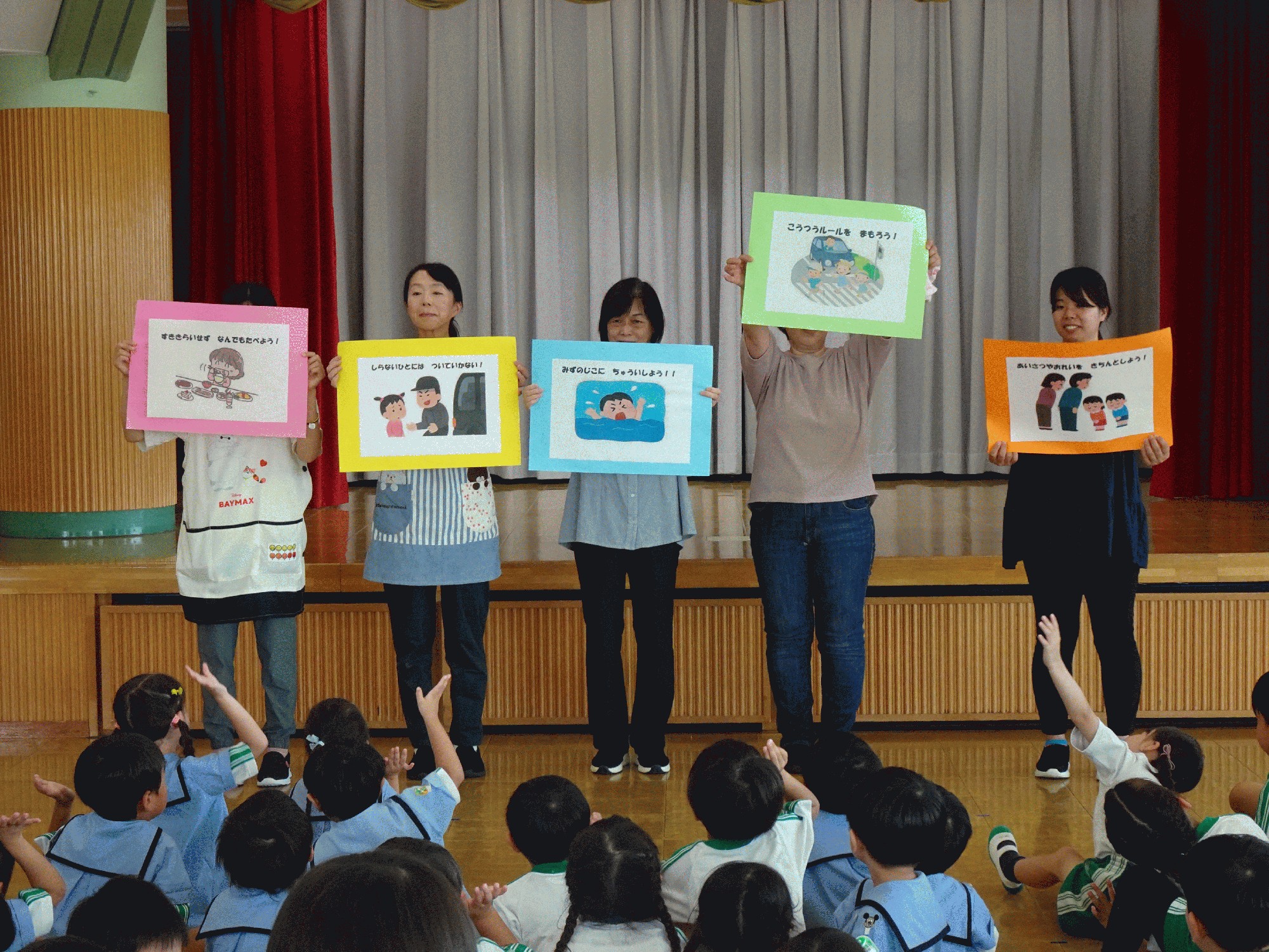 7月22日(月):今日は、第1学期の終業式を行いました。園長先生からは『1学期は、毎日の生活や行事など、いろいなところで頑張っていたり、お友だちと力を合わせて仲良く生活したりしている、みんなのうれしい姿がたくさん見られました。明日から始まる夏休みが、みんなにとって楽しいものになるように、交通事故や水辺の事故に遭わないように、安全や健康に気をつけてください。また、「早寝・早起き・朝ごはん」を守って、規則正しい生活を心がけてください。』と話がありました。先生達からも、「あいさつやおれいをきちんとしよう」、「みずのじこにちゅういしよう」、「こうつうルールをまもろう」、「しらないひとについていかないようにしよう」、「すききらいせずに、なんでもたべよう」と夏休みのお約束について話がありました。夏まつりや夏季保育には、元気いっぱいなみんなと会えることを楽しみにしています。