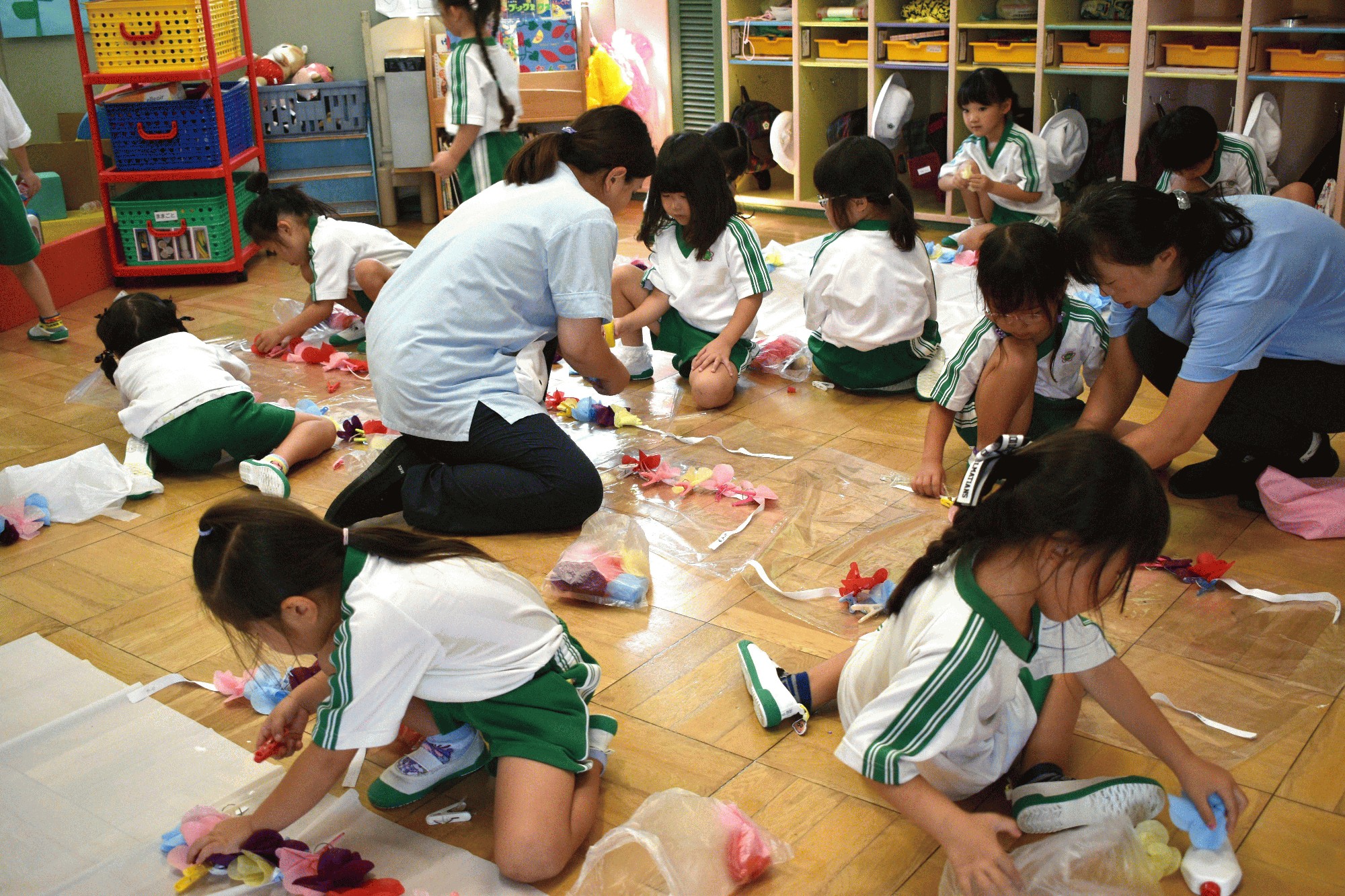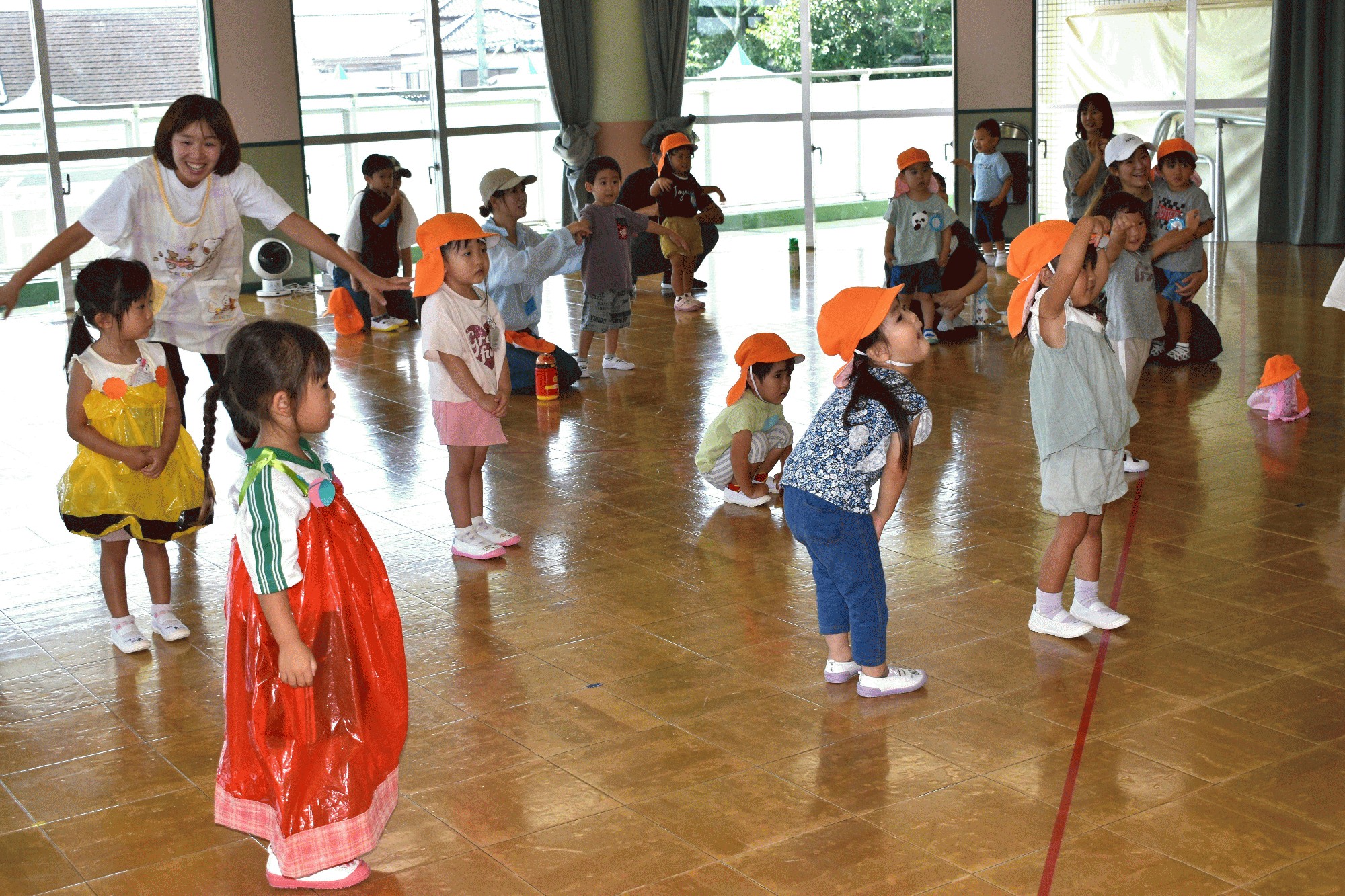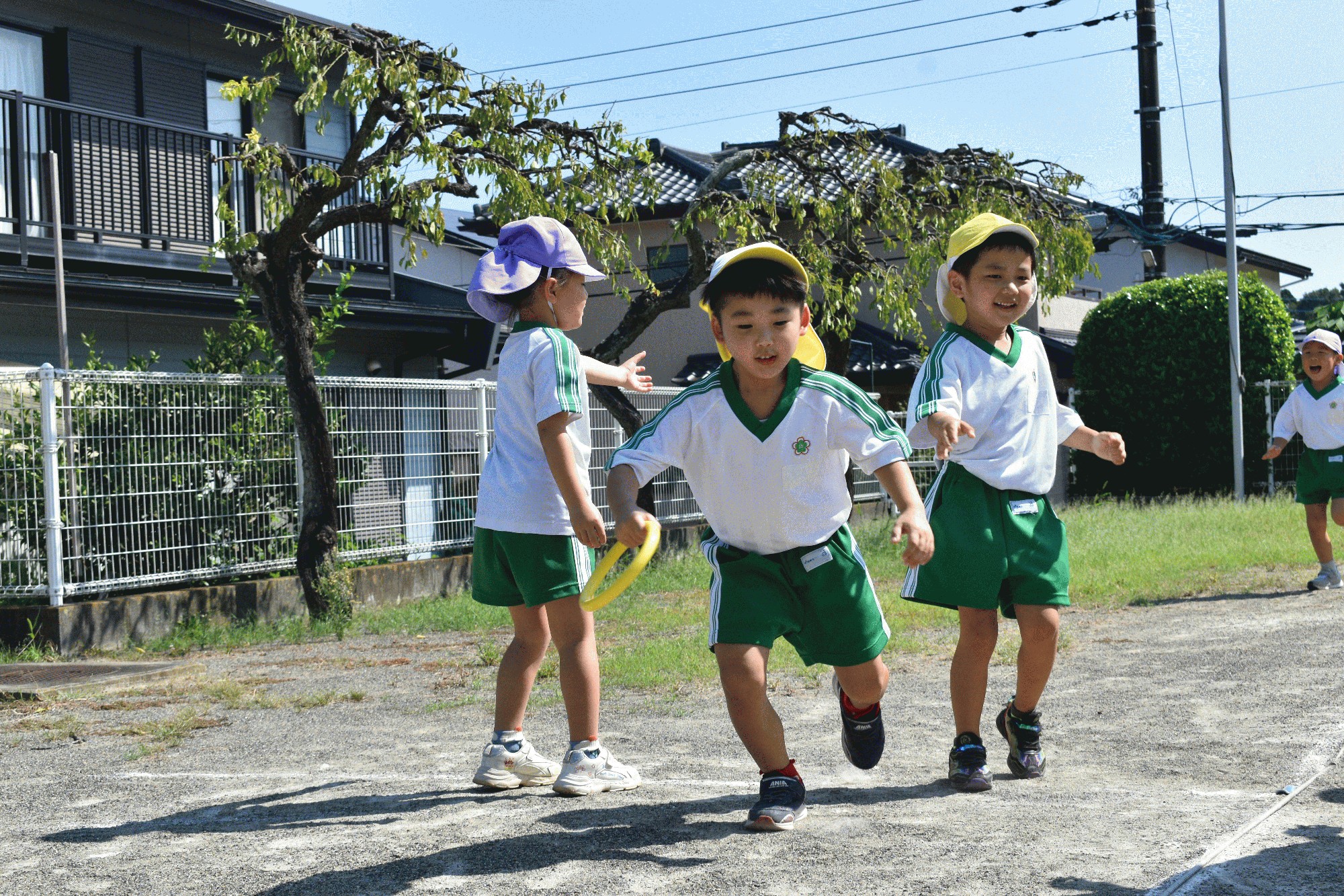 9月3日(水):2学期が始ってからも、酷暑が続いていて、園庭での運動ができませんでしたが、朝の涼しいうち、年長の子ども達が園庭でリレーの練習をしました。今日は「ひよこフレンド教室」があり、親子でりす組の子ども達と一緒に、年長の子ども達の動きを見ながら、入場行進やディズニー体操、お遊戯の練習をしました。年中では、昨日に引き続き、お遊戯の衣装や冠作りをしたり、昨年の運動会のDVDを見ながら、種目の確認をしたりしました。年少の子ども達は、昨日に引き続き、敬老の日におじいさんやおばあさんに送る手作りのハガキ作りの続きをしました。年長の子ども達も、おじいさんやおばあさんに送る手紙にイラストを描いていました。