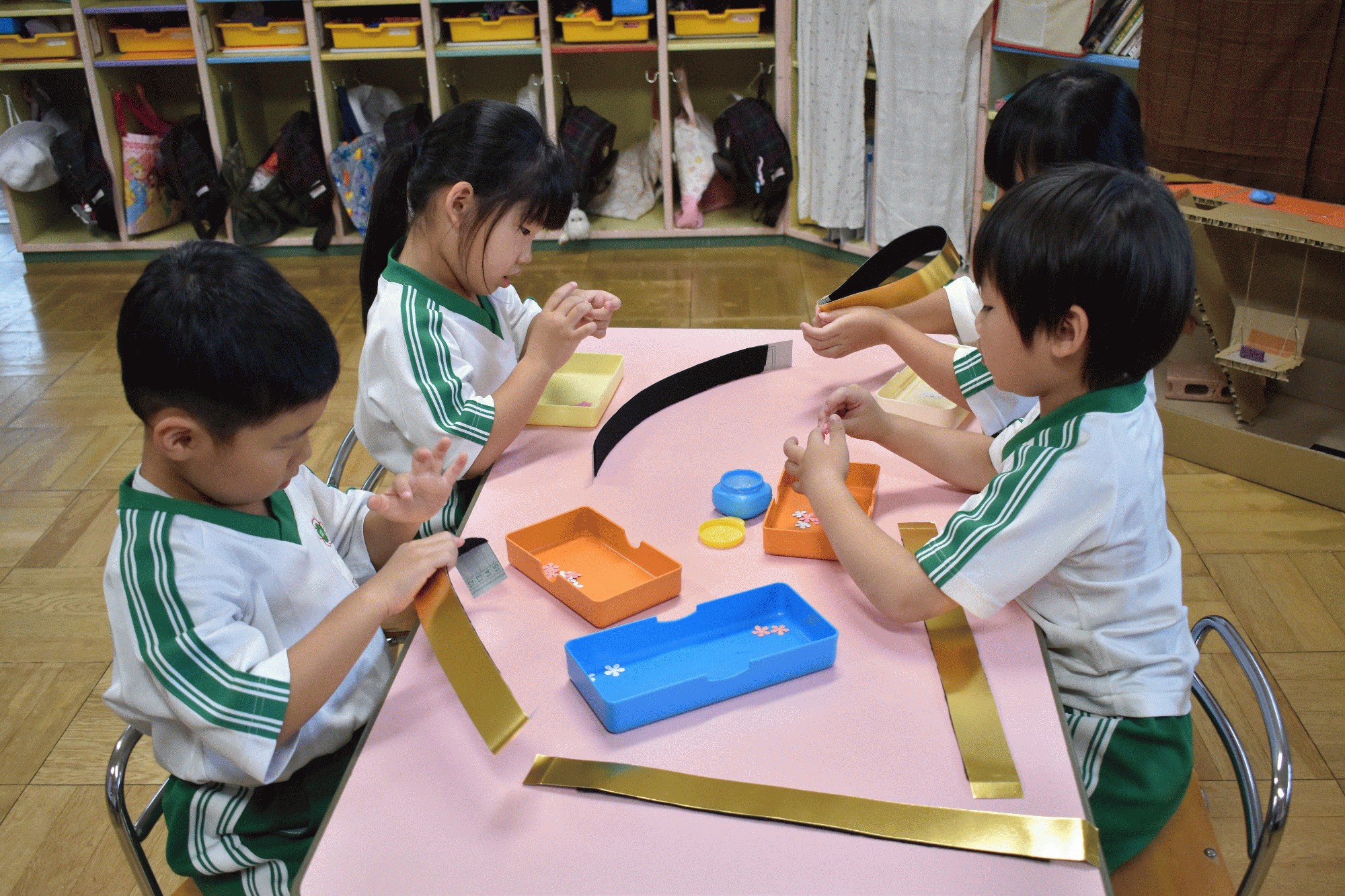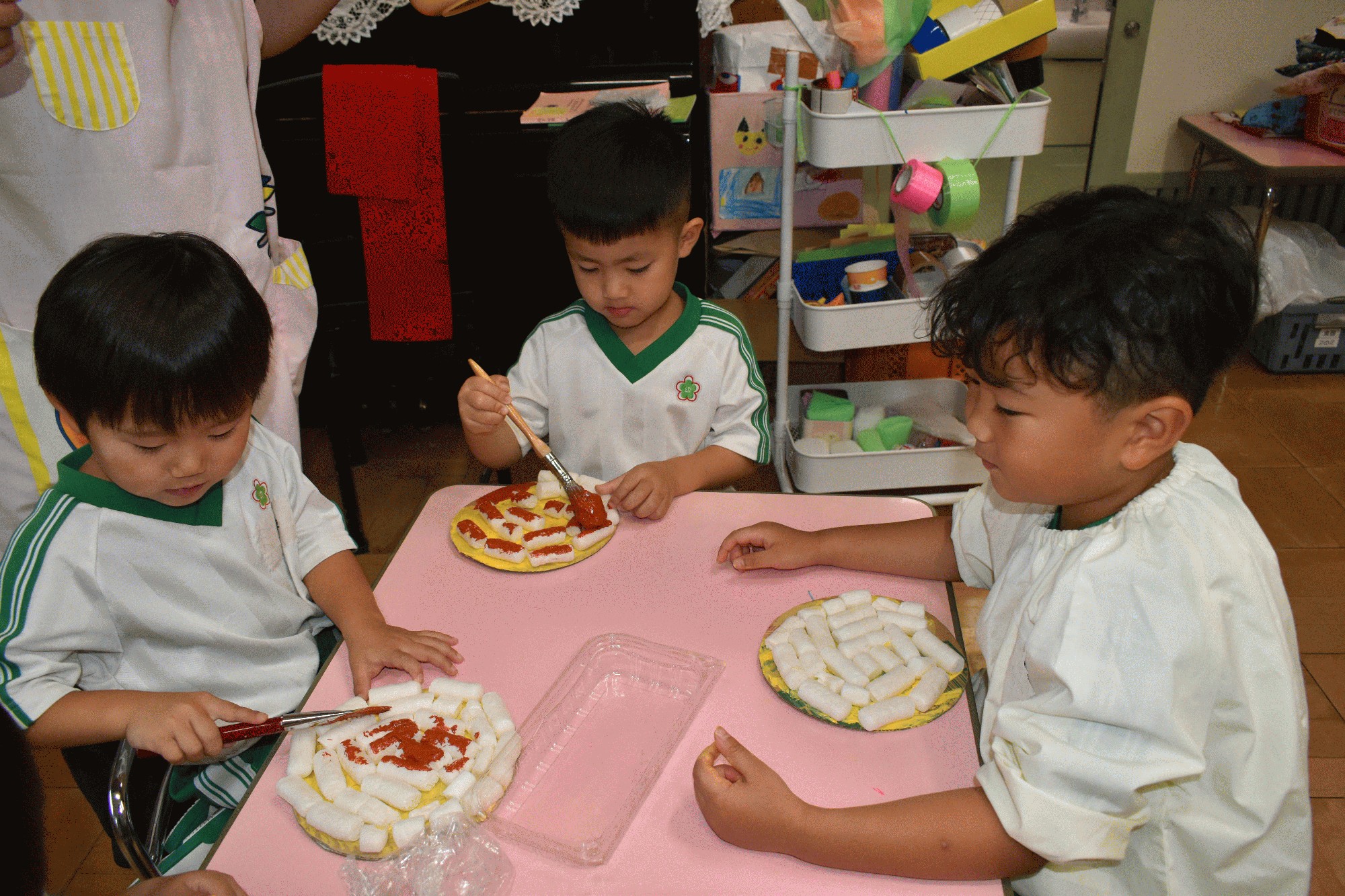 9月5日(金):今日は雨天のため、屋内で運動会の練習や製作活動を行いました。年少は、2階の遊戯室で、障害走の「はい!ポーズ」や団体競技の「おつかいありさん」の練習をしました。年中は、英会話があり、今日は、色々な動物の名前の発音を練習し、カルタ取りや椅子取りゲームを通して、動物の名前を覚えました。英会話の後は、お遊戯「アロハ・エ・コモ・マイ」の練習をしたり、障害走の「おまかせ!みんなはピザ職人」で使うマルゲリータやシーフードなどのピザ作りをしました。年長の子ども達は、敬老の日の手紙を完成させたり、お遊戯「ひらりと桜」で使う冠を作ったり、障害走の「夢に向かって みどり万博」の練習をしたりしました。