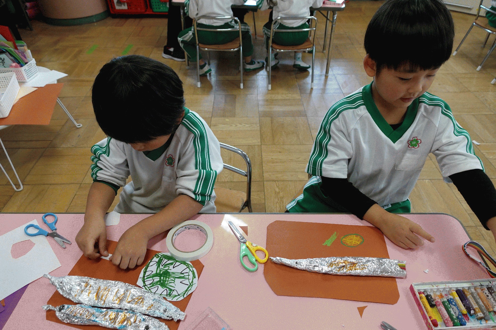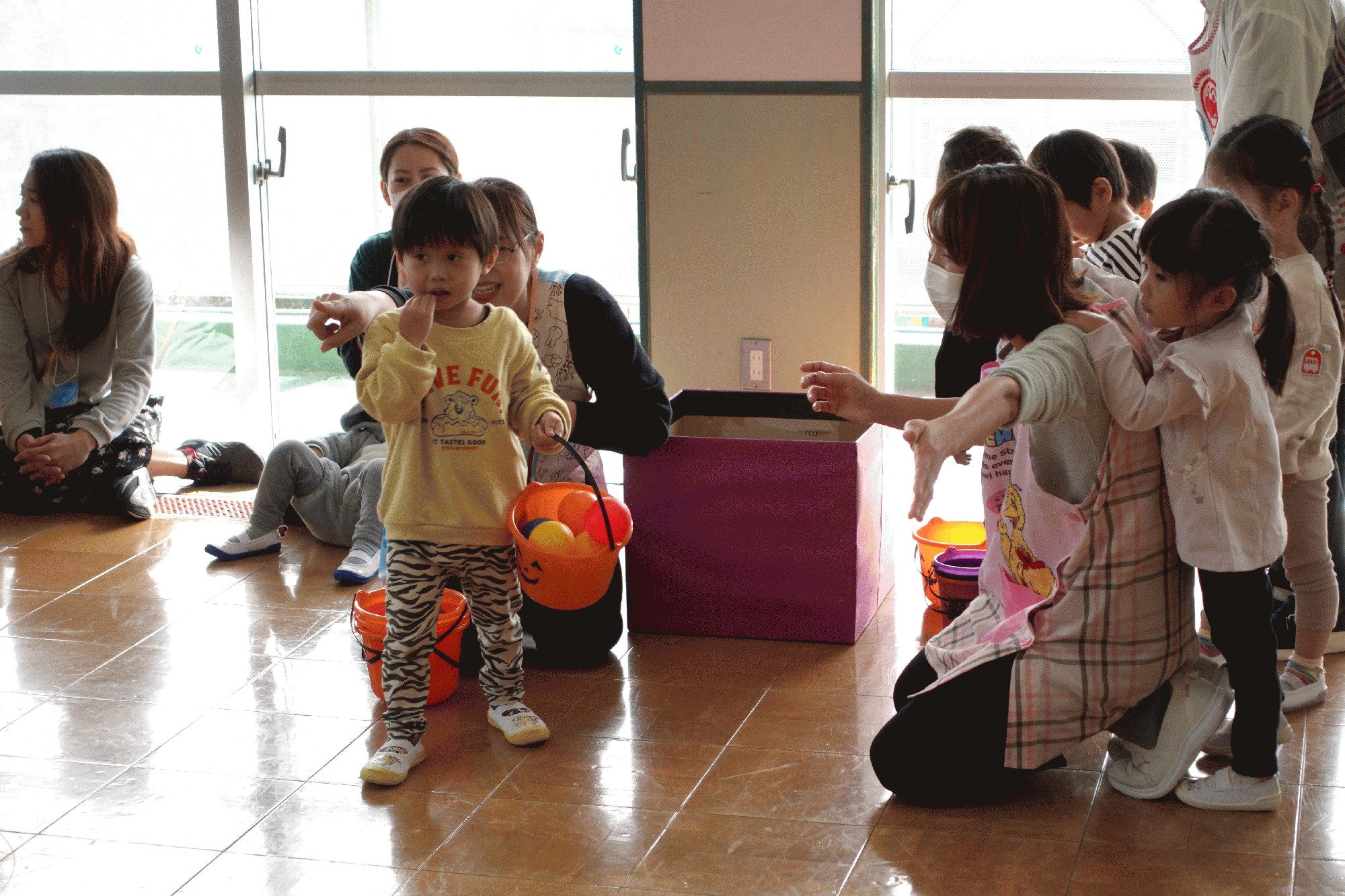 10月29日(水):登園後、年中の子ども達が、「みどり畑」にスナップエンドウとキヌサヤエンドウの種を蒔きました。クラスごとに畑に入り、畝に、深さ3pほどのすじをつけ、一人3粒ずつ種を蒔いて、土を優しくかぶせていました。5月〜6月頃には、年中から年長に進級した子ども達が、たくさん実ったサヤエンドウを収穫する予定です。また、今日は「ひよこフレンド親子教室」があり、りす組の子ども達と一緒にハロウィンの飾り付けをした遊戯室で、キャンディーボックスリレーを楽しんだり、ハロウィンのおやつをもらったりしました。年長は、秋の味覚のサンマを製作したり、年少では、カスタネットやトライアングルなどの楽器で遊んだりしました。