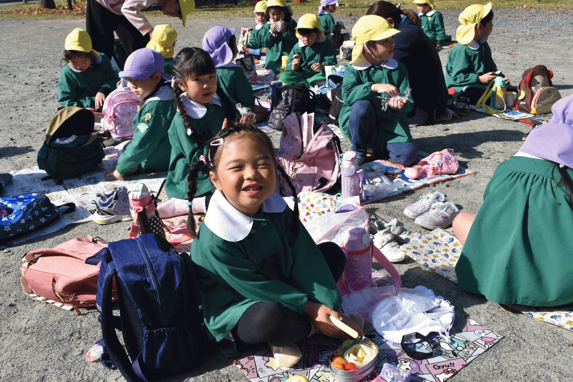 11月7日(金):今日は、年長の子ども達が園外保育に出かけました。まず、幼稚園バスで「マルト元吉田店」に出かけ、「買い物体験」をしました。子ども達は、一人150円のお小遣いを持って、お弁当の後に食べるおやつを買いました。事前にどんなおやつがいくつ買えるのか予習していたので、上手に品物を選んでいました。お店のご厚意でレジを2台子ども達用に準備していただいたので、全員がセルフレジを使ってお金の支払いをし、おつりとレシートを受け取ることが出来ました。続いて、徒歩で「吉田神社」に向かいました。神社では、先生から一人一人10円玉を受取り、お賽銭をあげて参拝しました。そして、みんなで仲良くお弁当と買い物体験で購入したおやつを食べたり、ドングリを拾ったりしました。暦の上では今日は立冬でしたが、天候にも恵まれ、暖かい日差しの中、子ども達は晩秋の一日を楽しく過ごしました。なお、「吉田神社」から風船をいただきました。「マルト元吉田店」の皆さま、「吉田神社」の皆さま、お世話になりました。ありがとうございました。