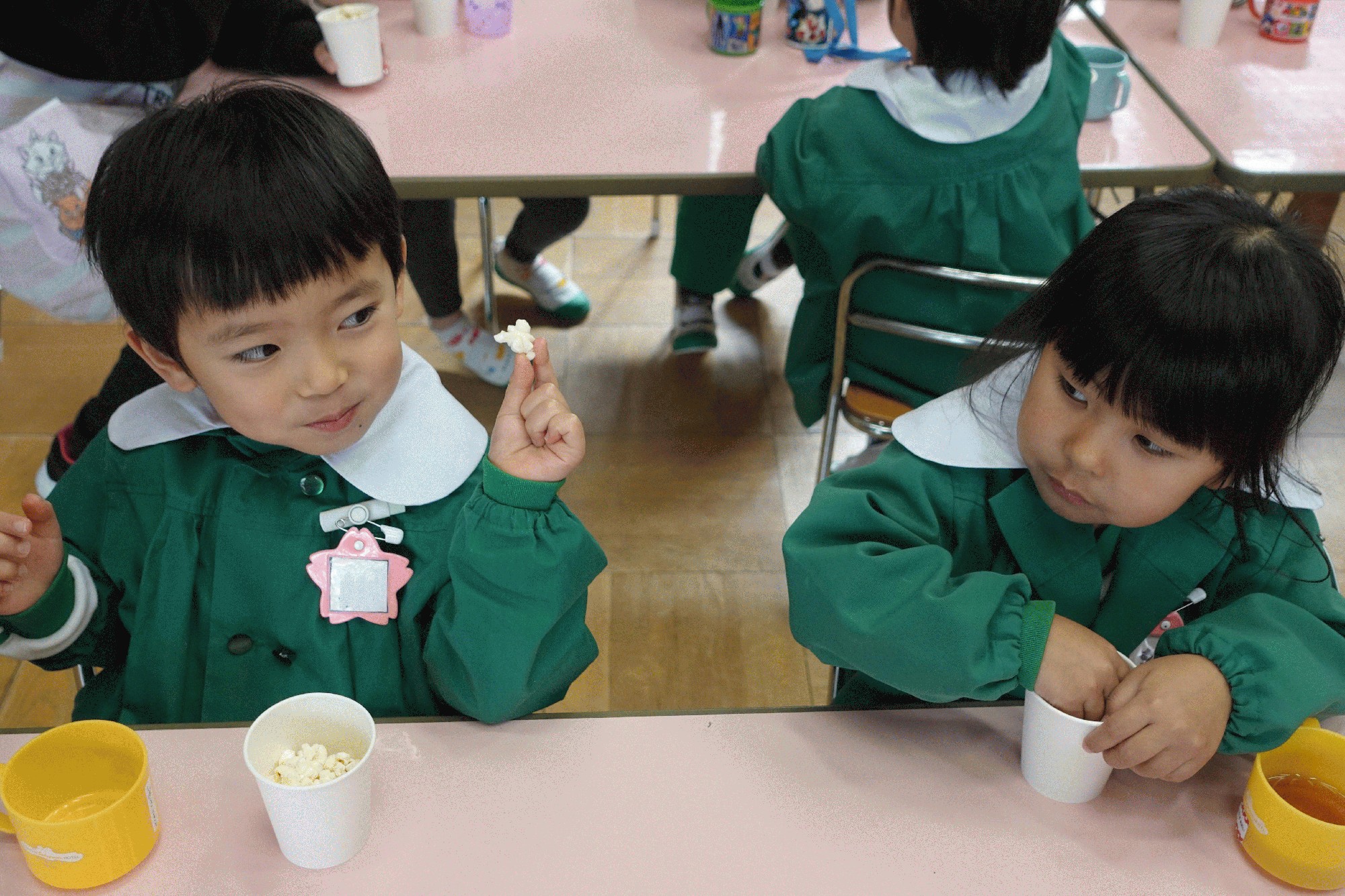 11月18日(火):今日は、りす組、年少、年中の子ども達が、2学期始めに、年長が『みどり畑』で収穫したポップコーン用のトウモロコシを使って、「ポップコーンまつり」を楽しみました。クラスごとに「ひよこフレンド親子教室」の部屋で、「ポップコーンマシーン」を使ってポップコーンを作りました。食塩とマーガリンを加えたトウモロコシをマシーンに投入し、しばらくしてポンポンという音とともにポップコーンがはじけると、みんな歓声を上げていました。できたポップコーンは保育室でみんなで試食しました。子ども達は、できたてのポップコーンをゆっくり味わいながら、おかわりをして食べていました。明日は、年長の子ども達が「ポップコーンまつり」をします。