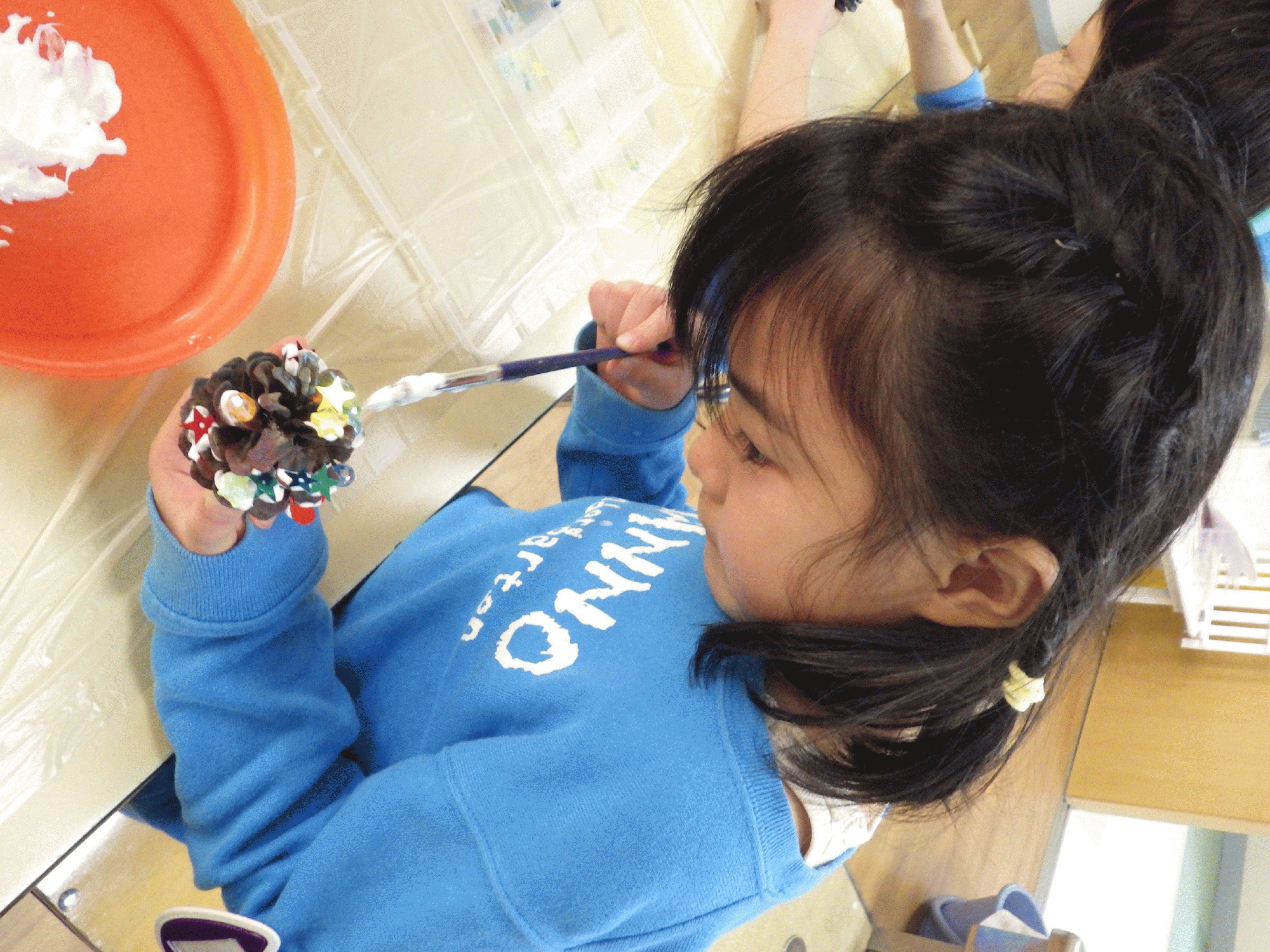 自分の好きな色に塗って、ビーズやスパンコールを装飾しながら「ちっちゃくてかわいいね」「キラキラになったよ」と普段はない素材を目の前に楽しそうに製作をしていました!