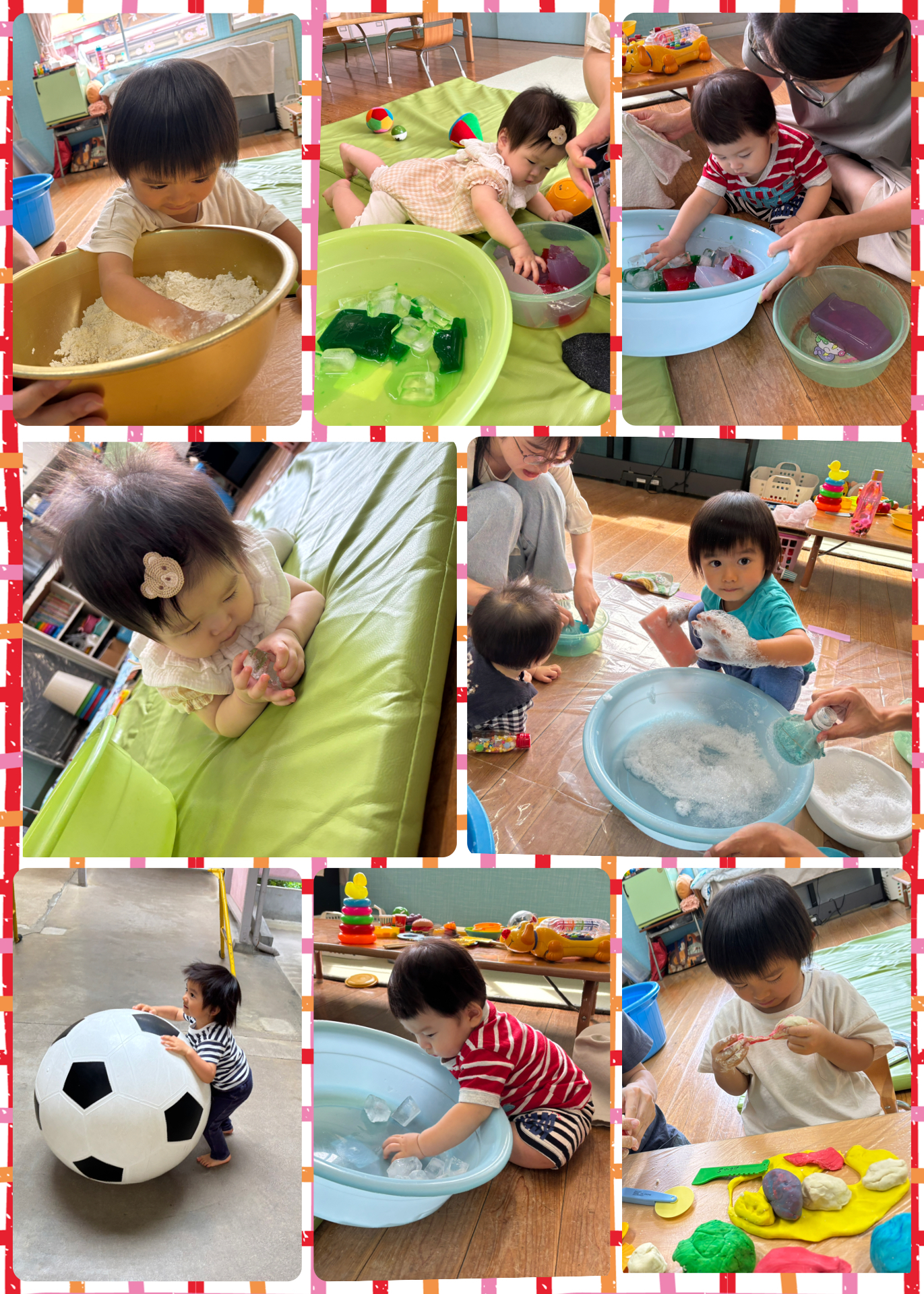 18日 感触遊び…氷・寒天セリーの感触を楽しんだり、スライム作りをしました。小さいお友達は直接触るのでなくジップロックに入れて、ぷにぷにの感触を楽しみました。