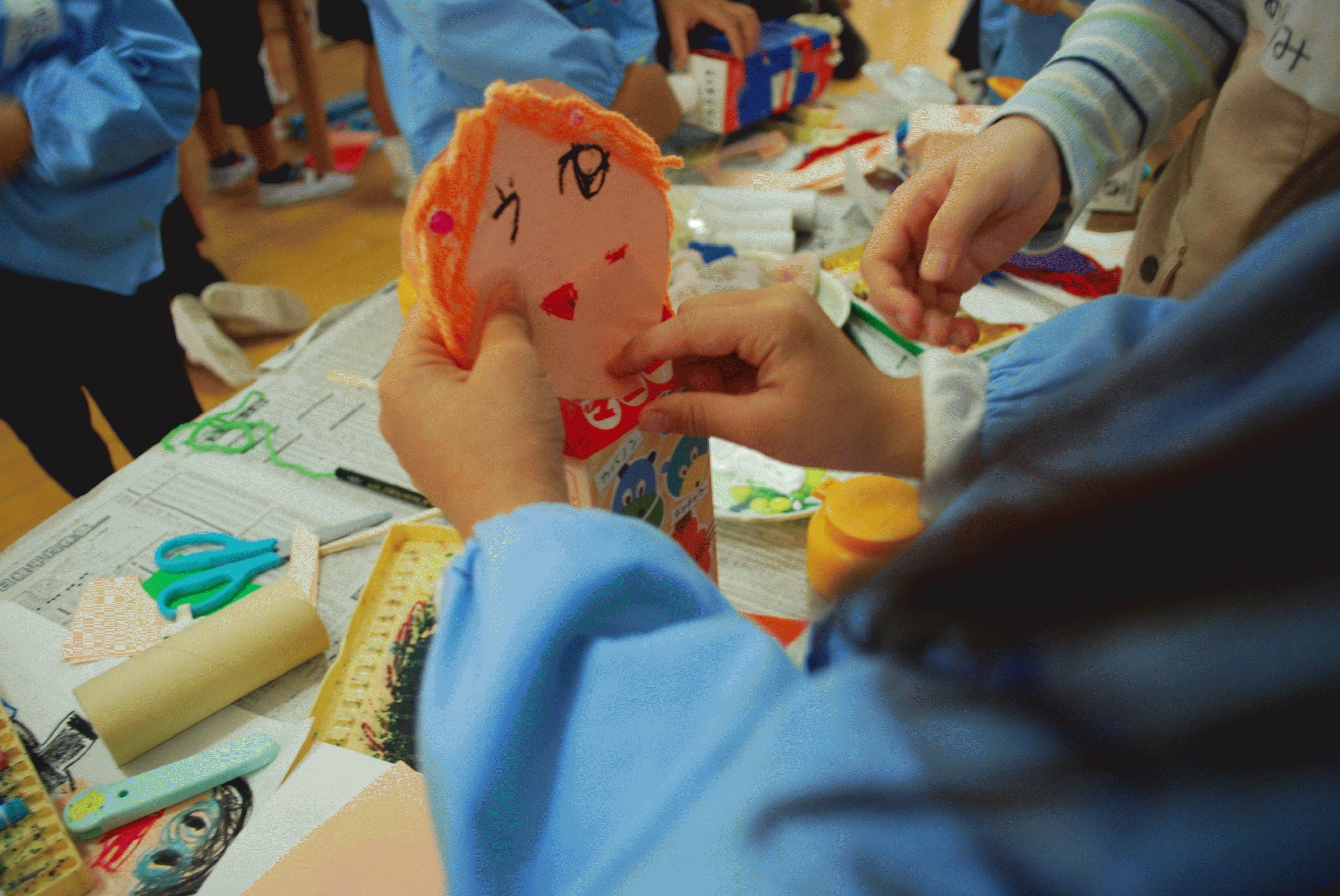 廃材収集でお持たせ頂いた「牛乳パック」を使って、「人形」を作りました。年長のお友だち1人1人が、どんな人形を作りたいか事前に考え、絵に描いていたので、それを参考にしながら製作を進めました。年長さんと小学生が2人1組になり、相談しながら行うのですが、年長さんが率先して進めたり、小学生がどんどん指示して進めてくれるなど、ペアによって様々でした。普段は、幼稚園の最年長児である年長さんが小さいお友だちを引っ張っていってくれるのですが、今日は、難しい作業があるとお兄さんに手伝ってもらったり、お姉さんにアイディアをもらって感心している姿がみられました。小学3年生のお友だちと比べると、年長さんもまだまだ小さく見え、一生懸命作業している姿はなんだか可愛らしく感じました。本日の作品は、作品展に展示致しますので、小学生との力作をごゆっくりご覧ください。どの作品も、個性豊かに出来上がりました。