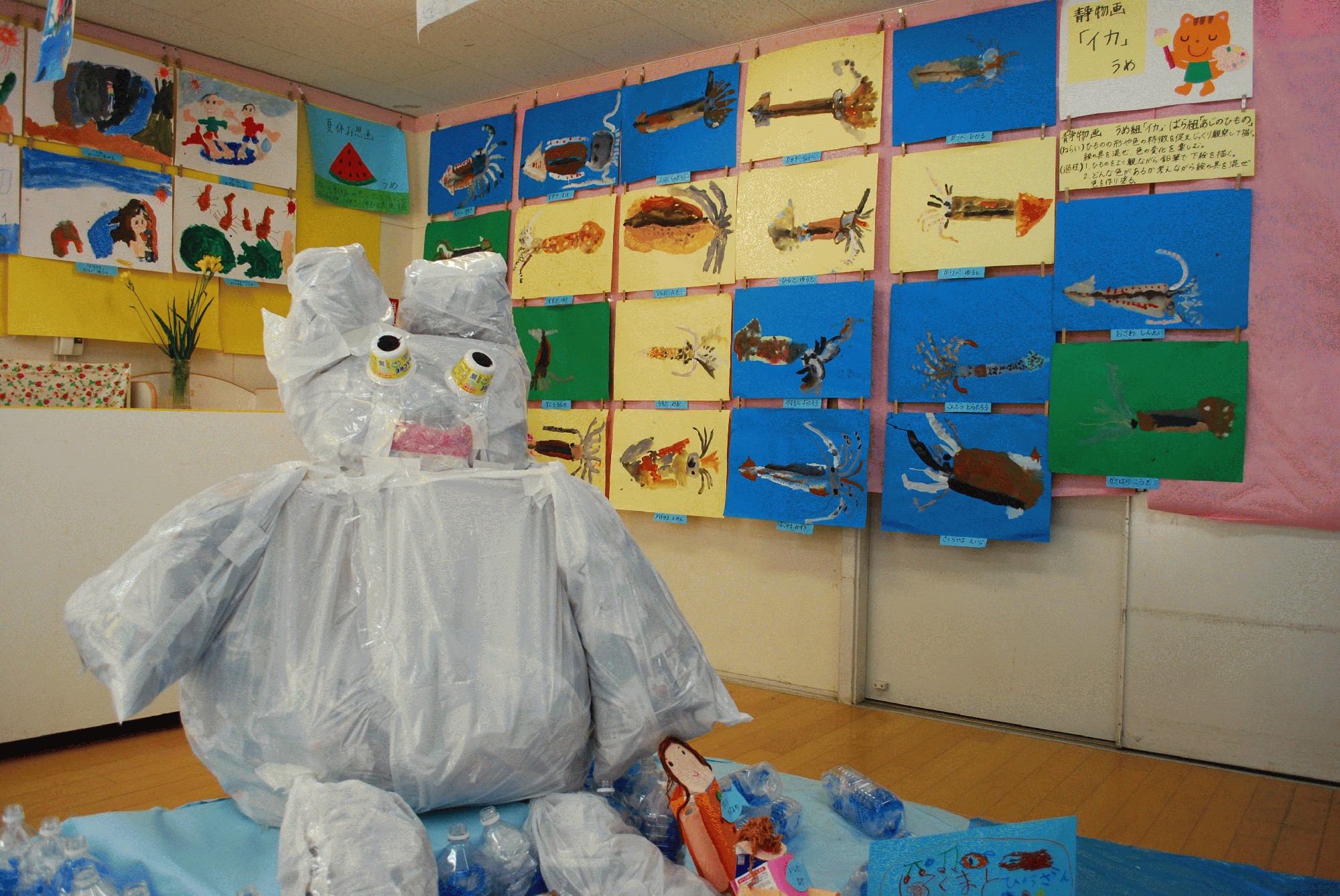 今日は、年少組のお友だちと年中組のお友だちが造形指導の日でした。どちらの学年も自分たちの油粘土を使って製作しました。