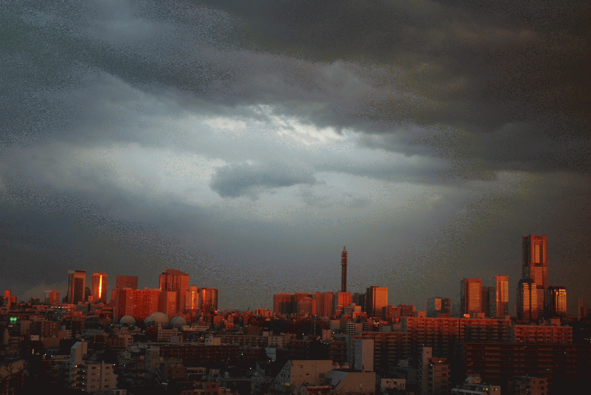 お写真は、幼稚園の屋上から見える夕焼けの景色です。ランドマークタワーや他の建物が夕日に赤く染められて綺麗だったので、思わずシャッターを下しました。