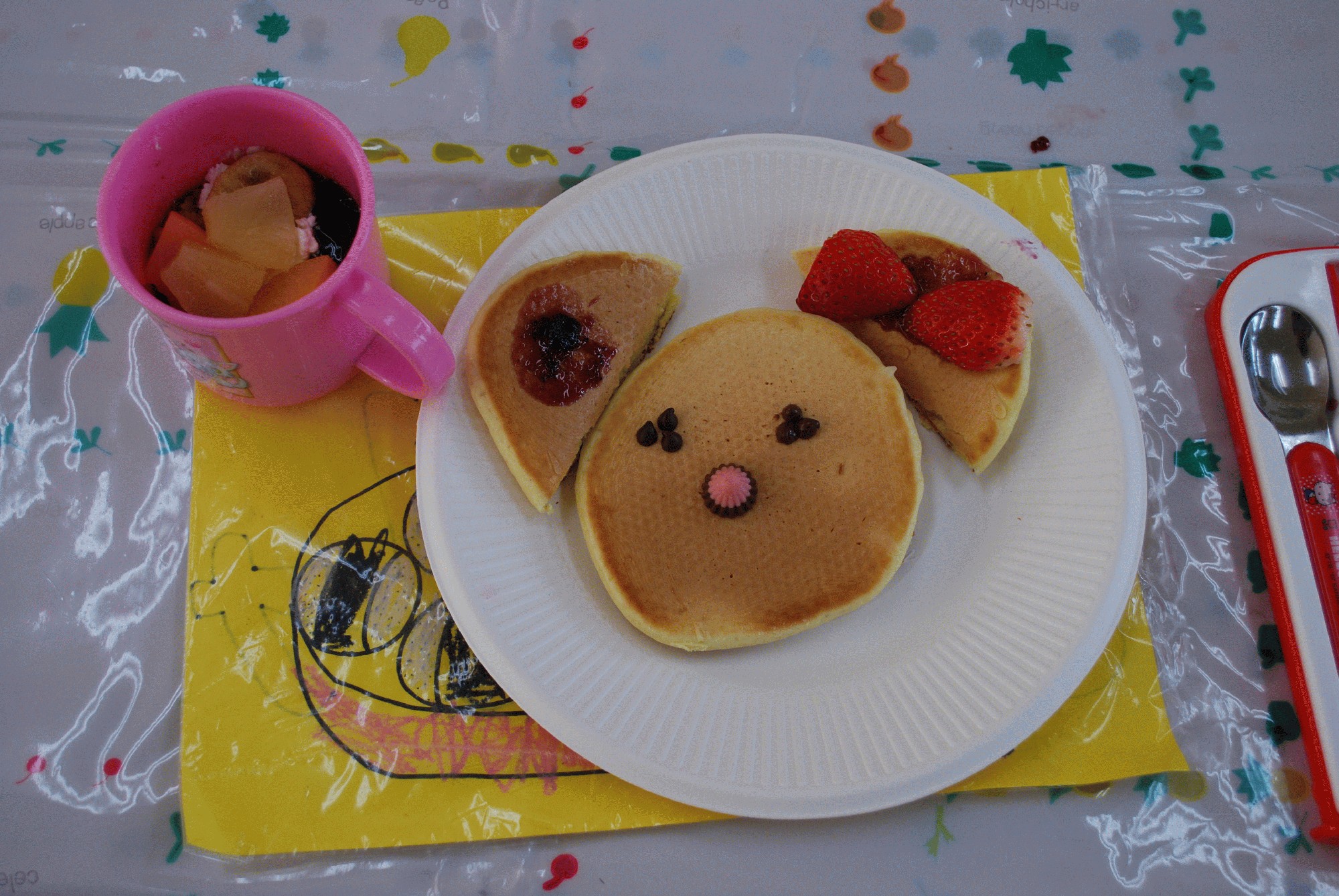 本日、年中組のお友だちは「お食事会」を行いました。 1人2枚ずつホットケーキを焼き、デコレートして、パフェも作りました。 1枚は顔にして、もう1枚は半分にしてクマさんの耳にしチョコで目を作りチロルチョコで鼻を表しました。 口には、ブルーベリージャムを使いましたが、苦手なお友だちはホイップクリームで代用しました。 いちごをリボンにしたり、蝶ネクタイにしたりと様々なクマさんホットケーキが完成しました。 みんな小さなパティシエになっていました。