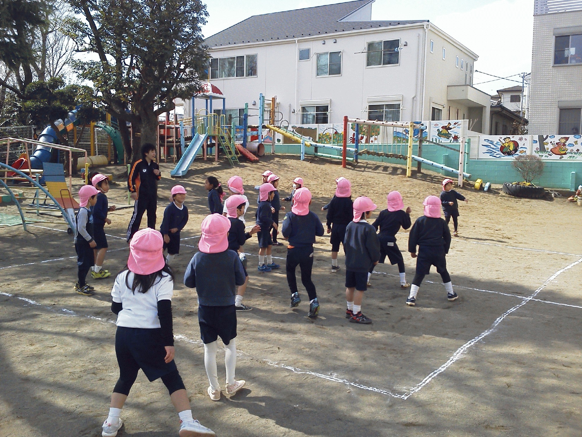 朝のお外遊びでも、先生と大縄をしています。