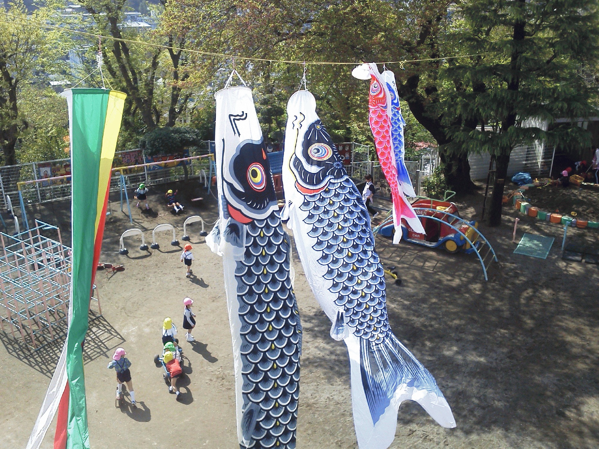 お写真は、立正幼稚園の鯉のぼりです。お友だちに負けないよう、元気に泳いでいます。