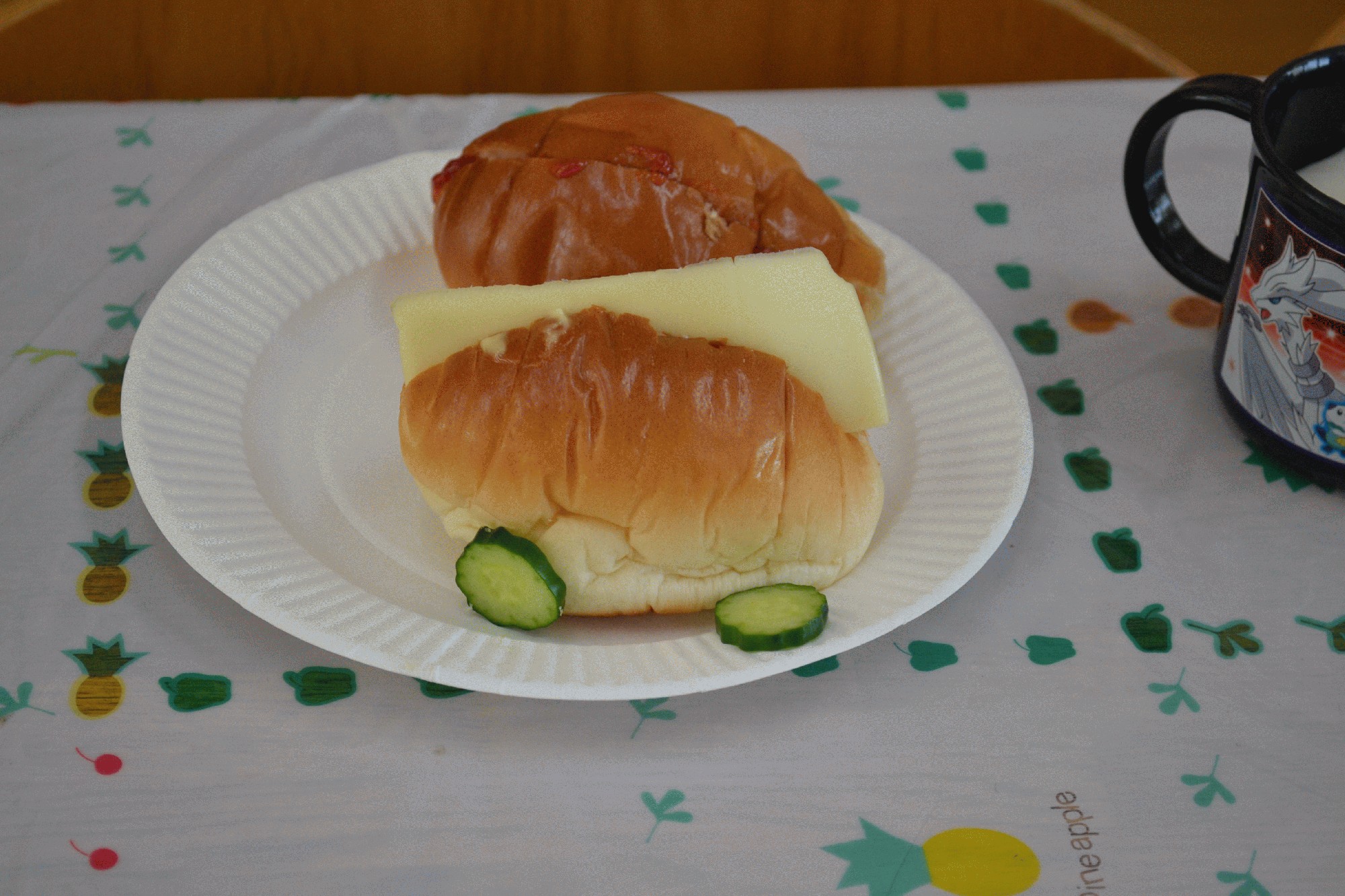 本日のお写真は、「きゅうりのタイヤのサンドウィッチカーとおいしいジャム入りバターロールパンです。」