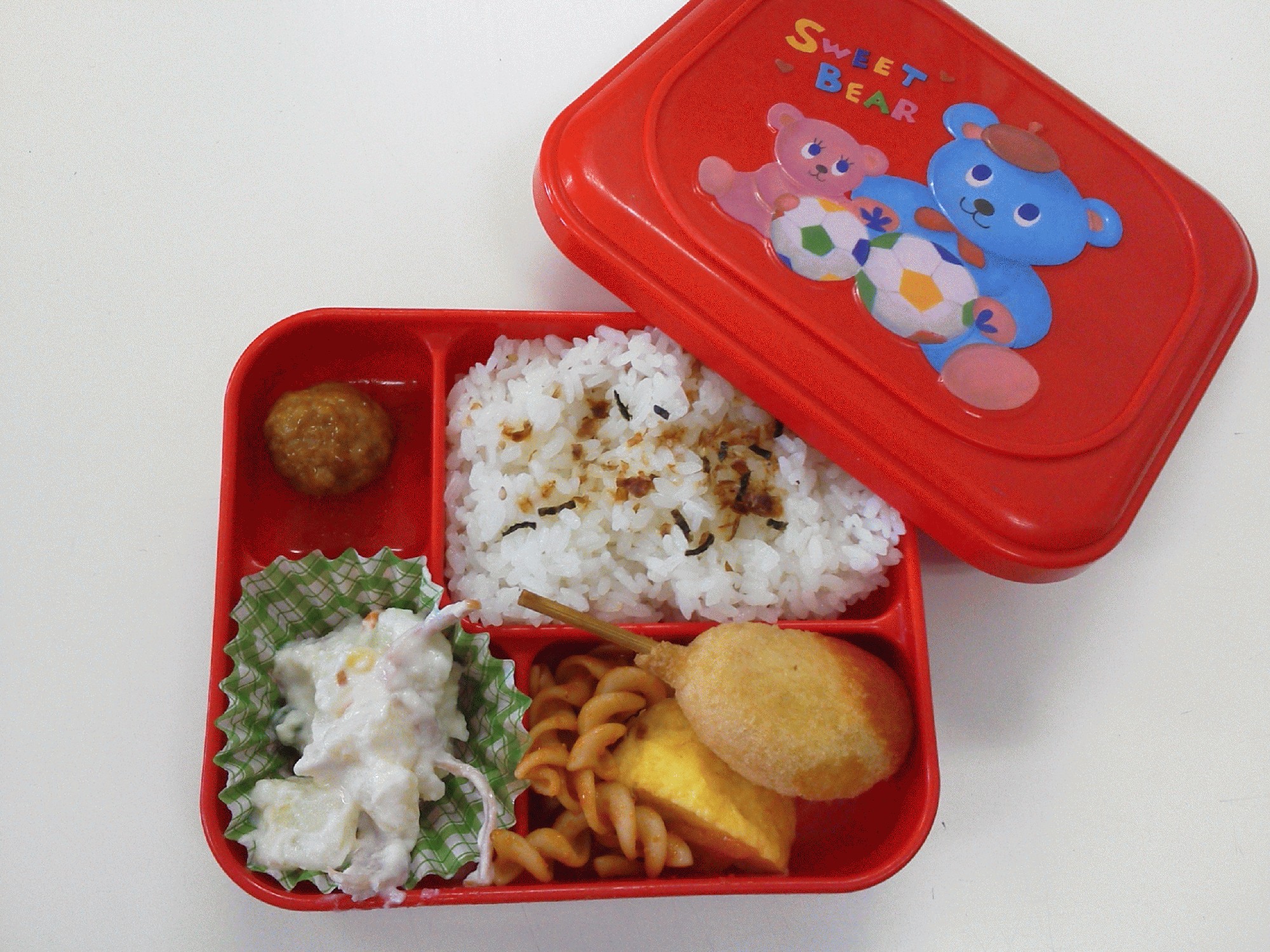 台風4号の接近に伴い、大変蒸し暑い1日となりました。 今夜から明日にかけ、関東にも上陸して参りますので、 十分にご注意頂きたいと思います。 【本日のなかよし給食のメニュー】 @ミニドッグ Aオムレツ Bマカロニソテー Cハム入りポテトサラダ D肉団子 Eふりかけごはん アメリカンドッグが大好きな私には、嬉しいメニューでした。 本日もみんなで仲良く美味しく頂きました。 なかよし給食が始まって、本日で4食目となりました。 お友だちもだんだんと慣れてきたように思います。 月・木・金曜日には、引き続きパンの注文も承っておりますので、 ご利用いただきたいと思います。