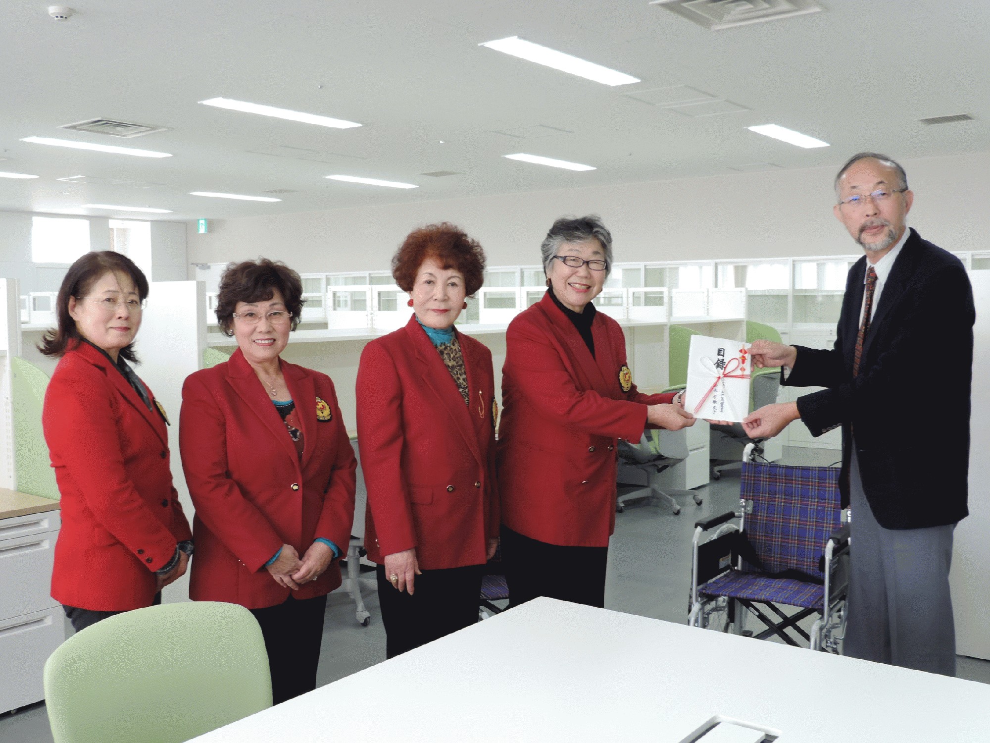 平成27年12月7日、新築オープン前の新小山市民病院2階医務局において、車椅子2台を贈呈しました。1月4日の診療開始前だったこともあり、最新医療設備はもとより景観抜群の院内をご案内頂きました。