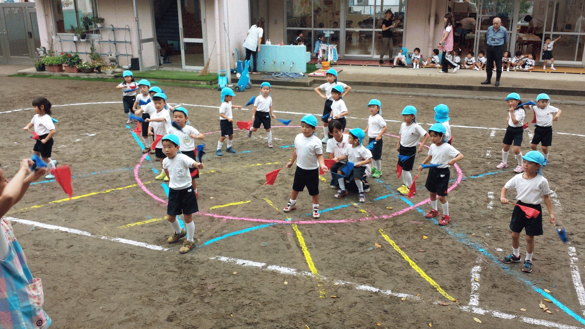 本日の写真「年長組 総練習日のフラッグ風景」