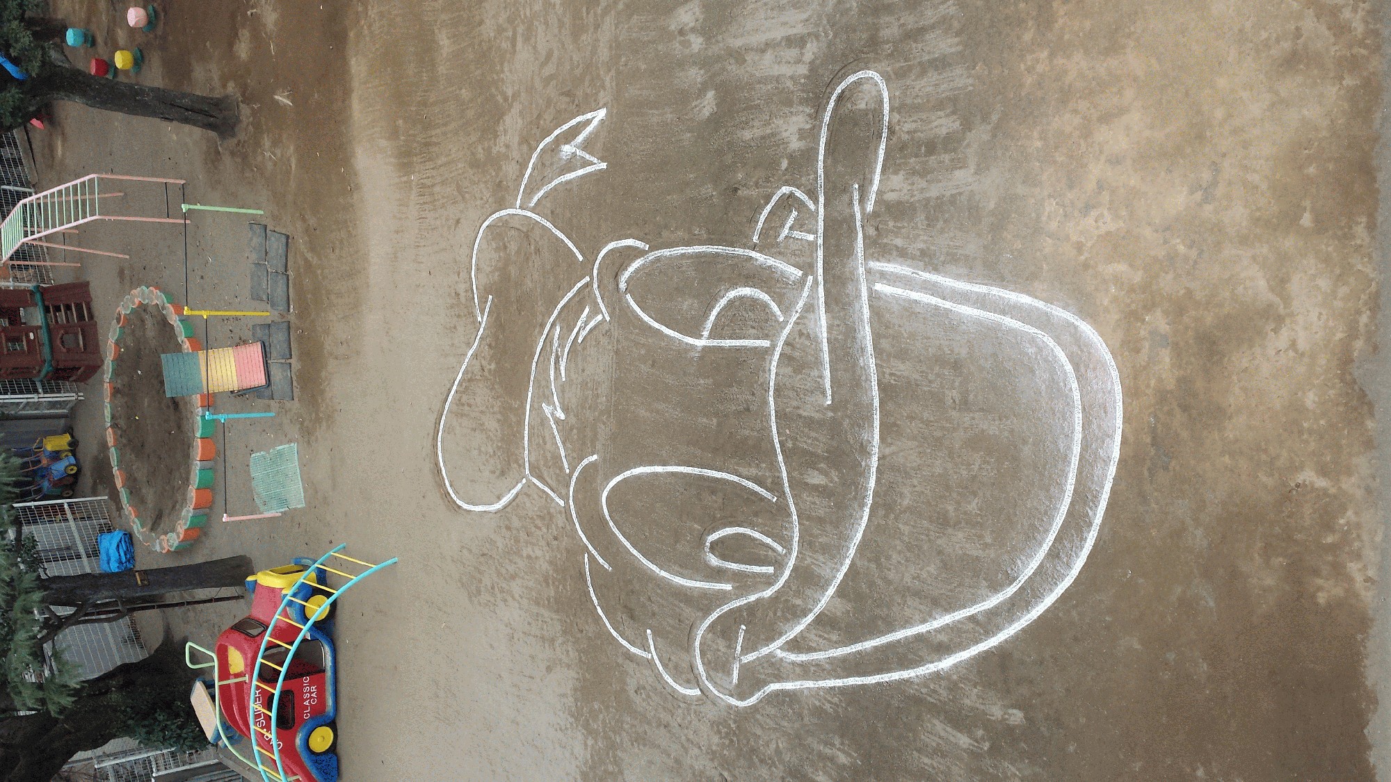 っと言っても、全然大したことを発表する訳ではないのですが。 園庭アートが子ども達にとても好評だったので、今日も頑張って 描いてみました。 先日、子ども達から言われていたドナルドダックを今回モデルに して、描きました。 画像とにらめっこしながら、きちんと下書きをして今回は ラインカーを使用して、よりよく見えるようにしました。 帽子が小さくなってしまったのが、反省点ですね。 しかし、子ども達はすぐに「あっ!ドナルド!」と分かったよう なので一安心です。 またチャレンジしてみたいですね。
