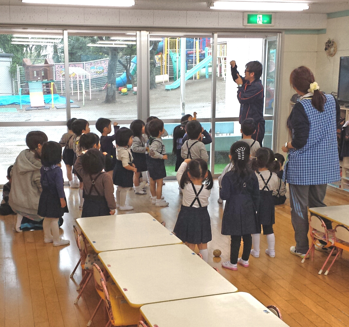 毎週火曜日は、こども体育研究所の体育の先生がきてくれて います。 体育は、学年よって集中力や体力が異なりますので、年齢に 応じて、年少・年中・年長と指導時間を変えています。 始めの指導は、先生の顔を覚えてもらうのと体操の説明を するだけなので体育着には着替えずお部屋で大人しく行なう つまりでしたが、、 前原先生は明るくてとても元気なので、子ども達に大人気!! お部屋でも元気いっぱい体操を教えてくれたのでみんなも とっても楽しそうでした!!