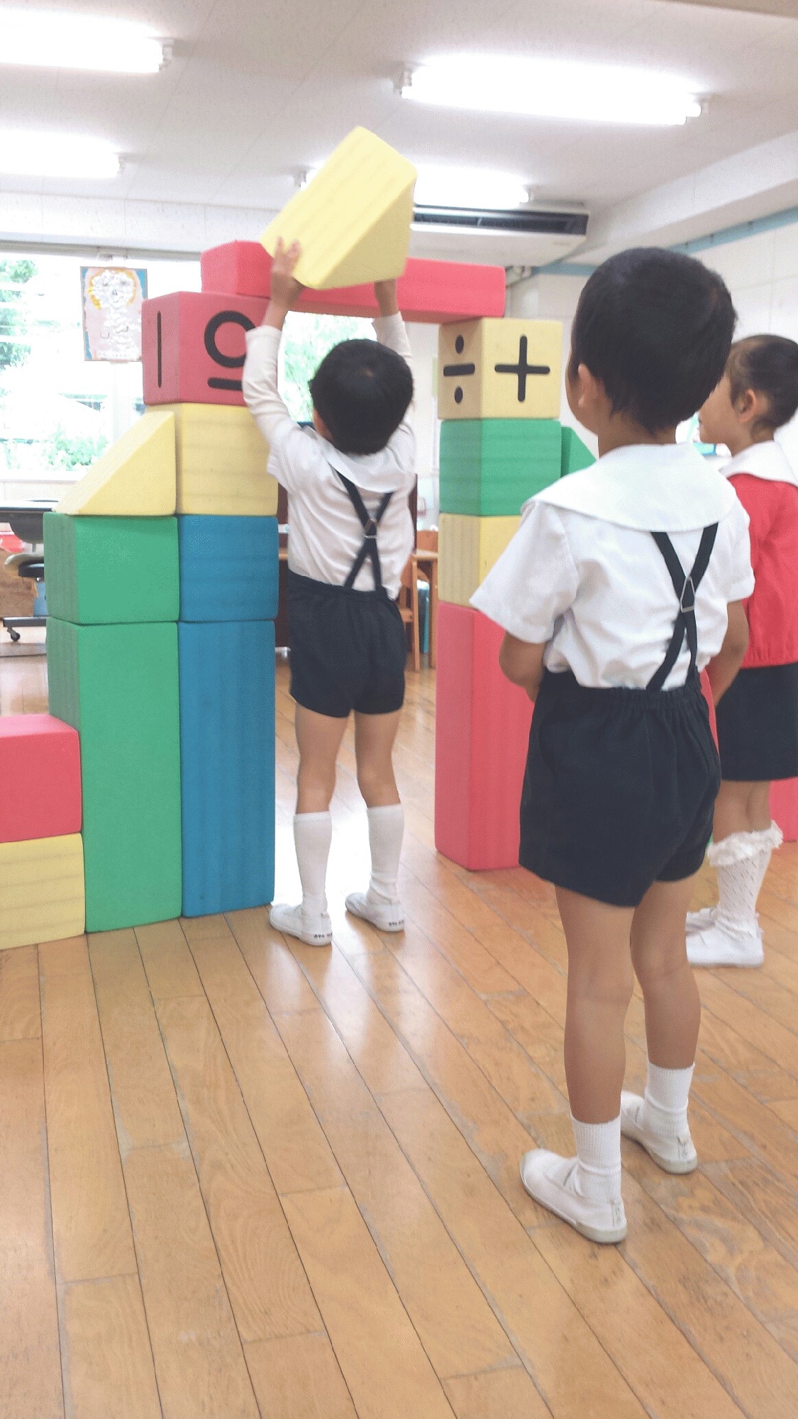 雨が降ってしまうとお外で遊べないのでお部屋遊びに なります。 お部屋の中でも、ブロックや積み木、おままごとの 玩具や塗り絵、パズル等々があります。 大型ブロックもみんなの人気玩具の一つですが、 このブロックは子どもたち位大きなものもあるので 遊びごたえがありますね!! 子ども達は「今日は大きな門を作る」というので、 様子を見ていました。 すると、みんなでアイディアを出し合って立派な 門が出来上がりました。 子ども達は膝を曲げなくても通れる程の門が出来ました。