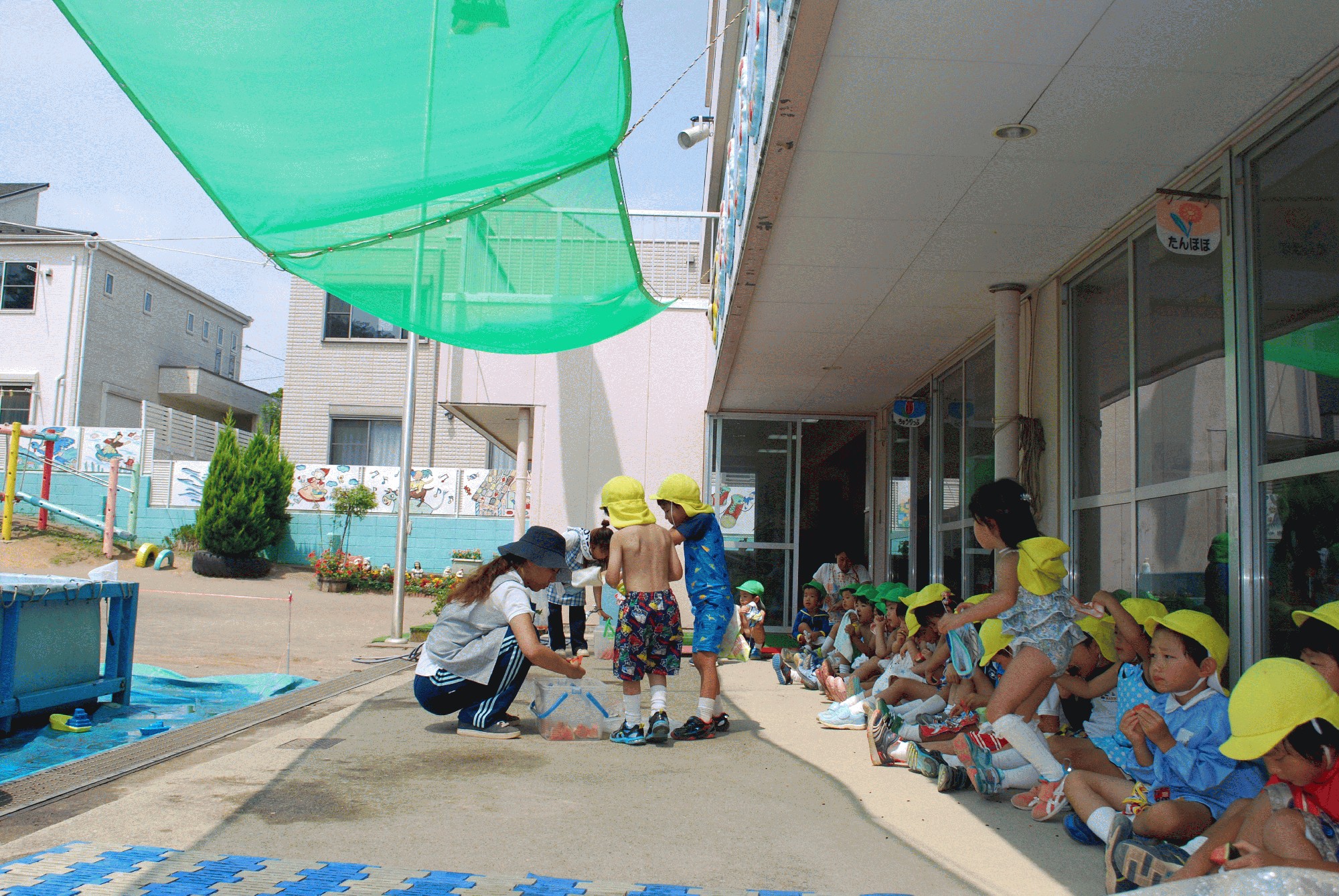 写真は、スイカをおかわりする年中組さんたちの様子です。