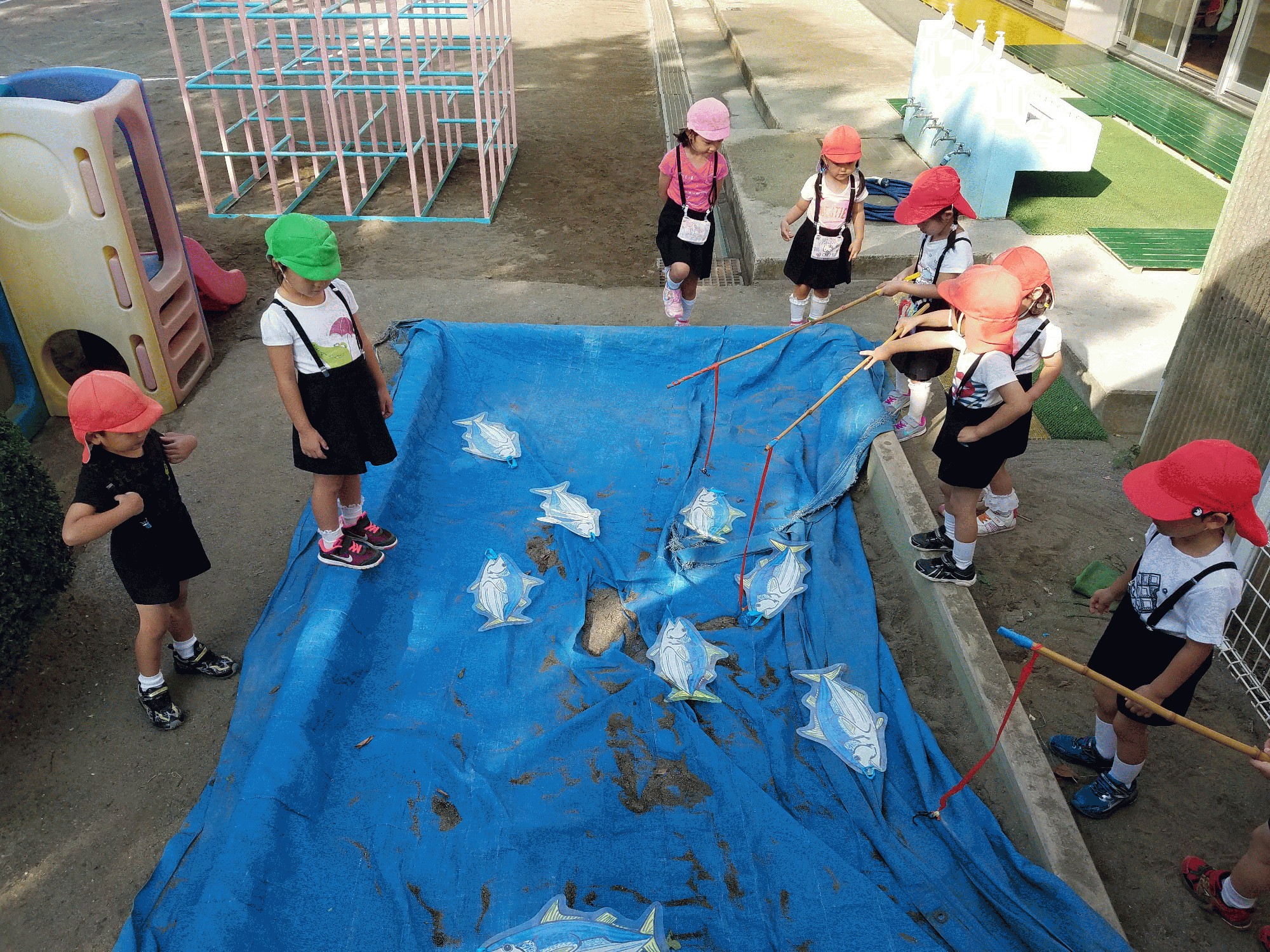 子ども達に遊んでもらおう!!と釣り竿を持ってお外に