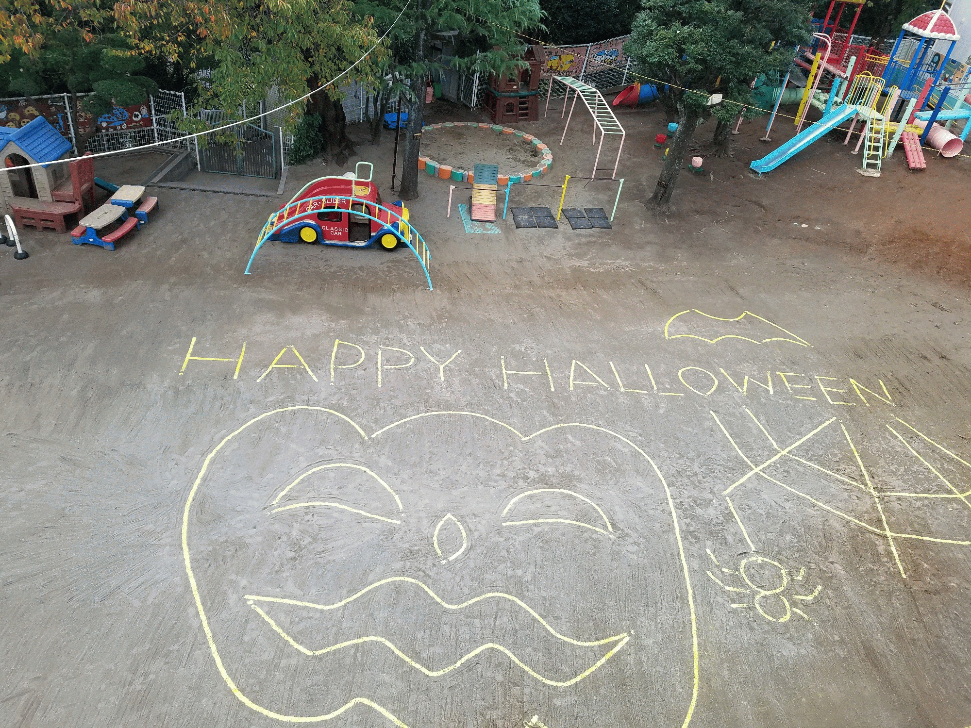 近年のハロウィンブームには、驚きますね。 10月になるとテレビもデパート・商店街・町中がハロウィン 一色になってくる程、大人気ですね。 沢山の方が、仮装をしたりパーティーをしたりと、すっかり 日本の一大イベントになりました。すごいですね。 今ではバレンタインデーよりも人気のイベントのようです。 しかし、翌朝すっかり疲れ切ったゾンビなんか歩いていて、 びっくりしたなんて話もありますから、ほどほどにですね。 立正幼稚園は、お寺の幼稚園なので行事などはありませんが、 子ども達に少しでも楽しんでもらえるように園庭アートを 行いました。