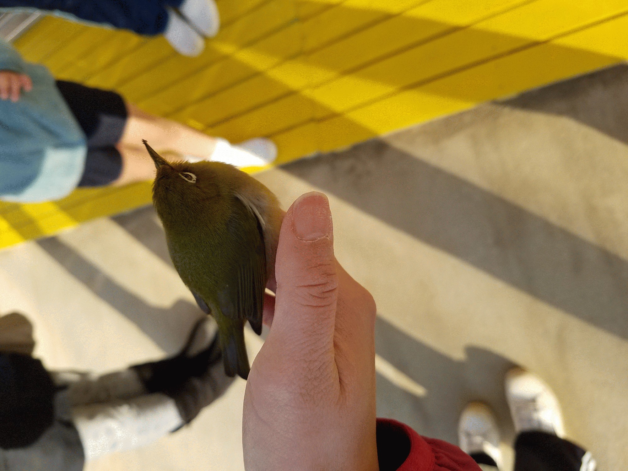 送迎の先生が、発見して近づいてみても全然飛ぶ気配がなくて