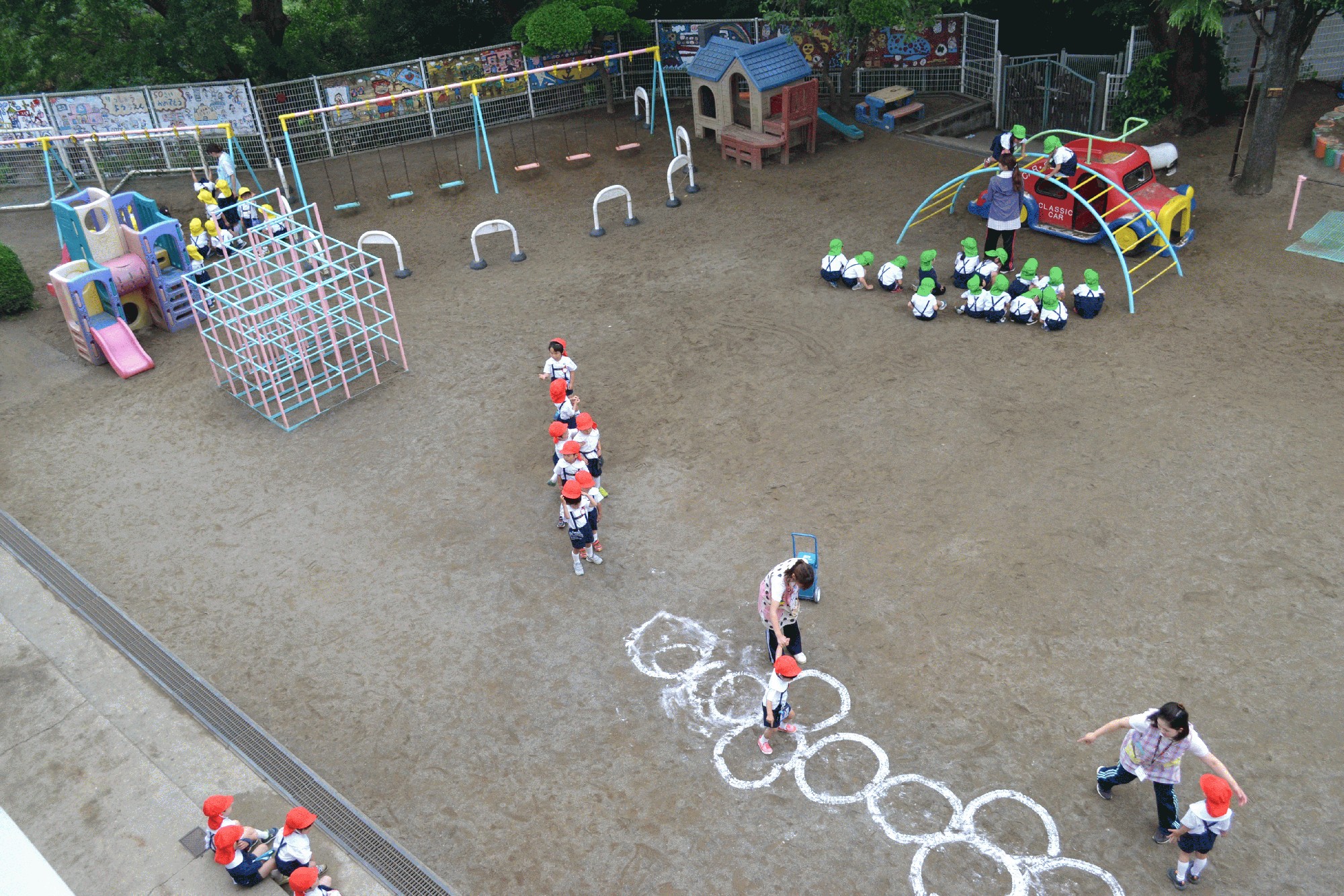 朝の体操の後に、体力をつける為に、太鼓橋やアスレチック 吊り輪などにチャレンジしています。 また、ボールキャッチやケンケンパなども行い、身体の使い方 上手くなるようにみんなで練習しています。 みんなの楽しそうな声が聞こえたので3階からカメラで パシャリ!! 公開保育でも、増強運動の様子は見れますのでお楽しみに!!
