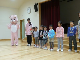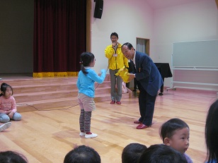 うさぎのぴょんちゃん、かまたのおじちゃんとマー坊の三人で誘拐に会わない為の4つのお約束を教えて頂きました。その後、きりん組さんが代表で知らない人に声かけられたときは、こんにちはと挨拶はしてもよいが、名前は教えない、怖くなったら助けてと逃げる。などのシュミレーションを皆の前でやってみました!皆一人ひとり上手にでき、褒めていただきました。どうかご家庭でも日頃からお子さん自身で身を守ること、誰かに助けを求められるように防犯意識を高められるようにお話しをしてみてください。
