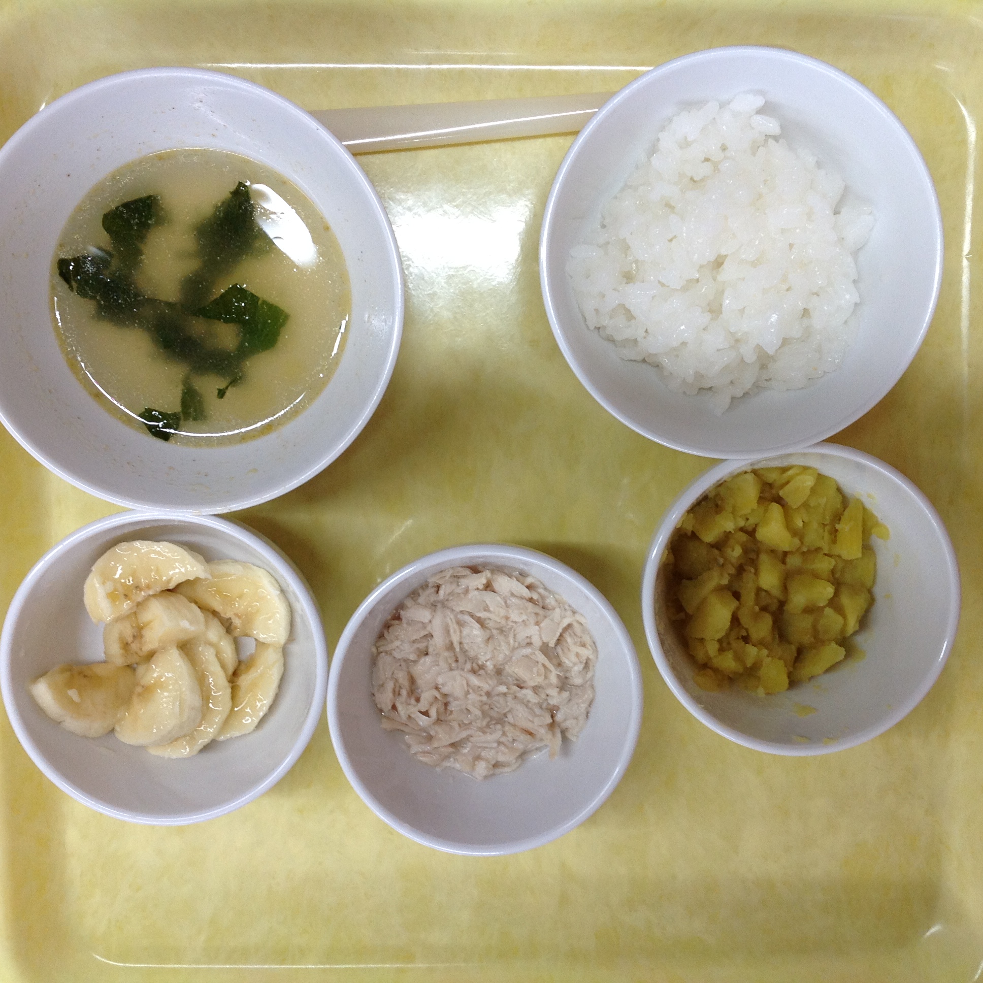 ごはん ささみフライ さつま芋のサラダ バナナ みそ汁