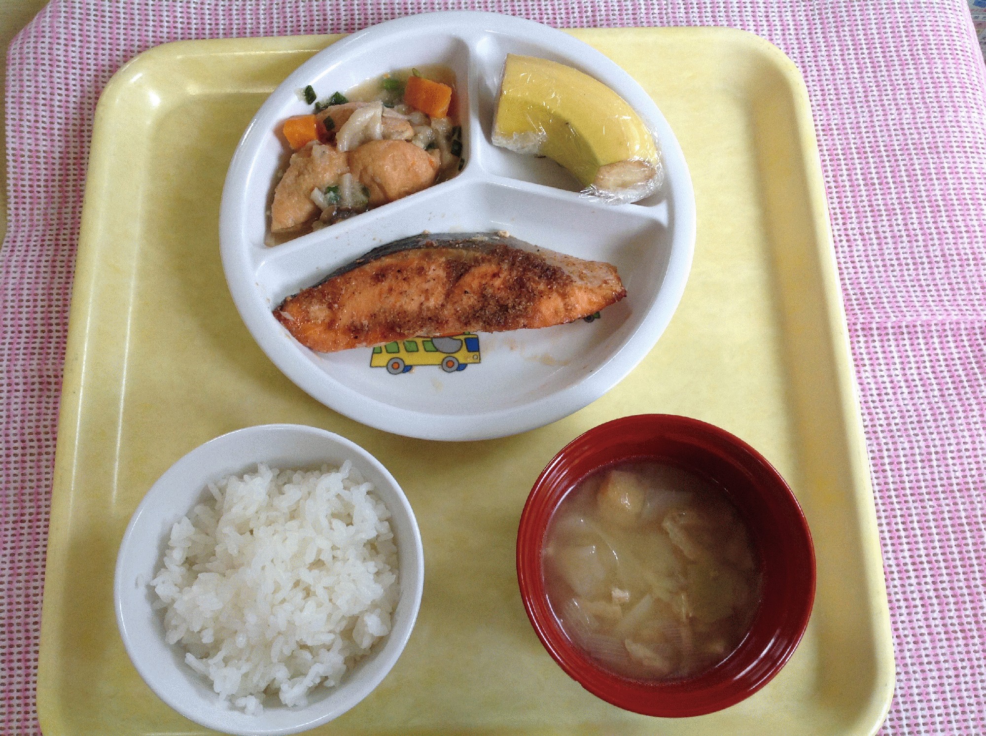 ごはん 鮭のごまだれ焼き がんものおろし煮 バナナ みそ汁
