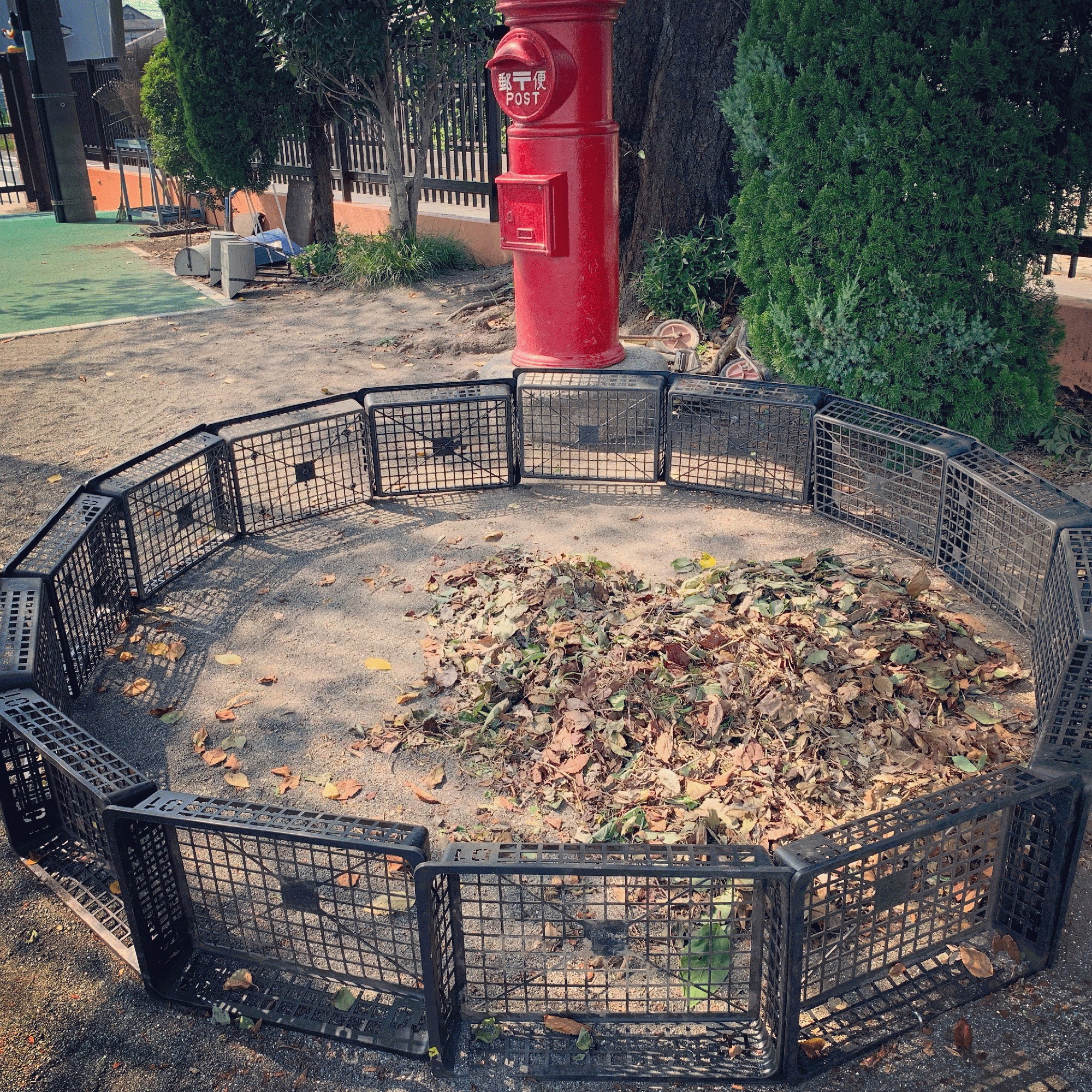 秋になると葉は落ちます。そこで一箇所に保管することで落ち葉のお風呂ができます。