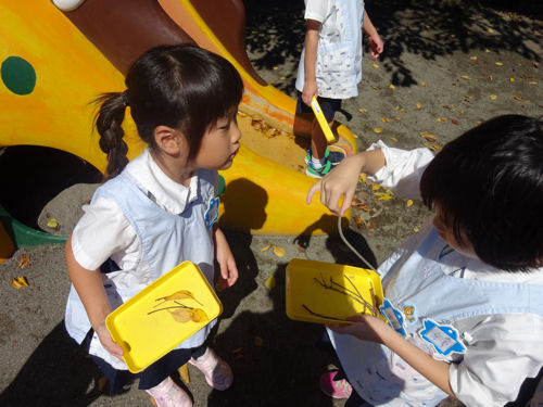 いざ園庭に探しにいくと「みて!黄色だよ」「緑色のもある!」