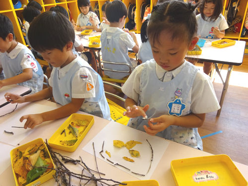 「折る!」「目とか口の形の葉っぱを取ってくる!」と素敵なアイデアが