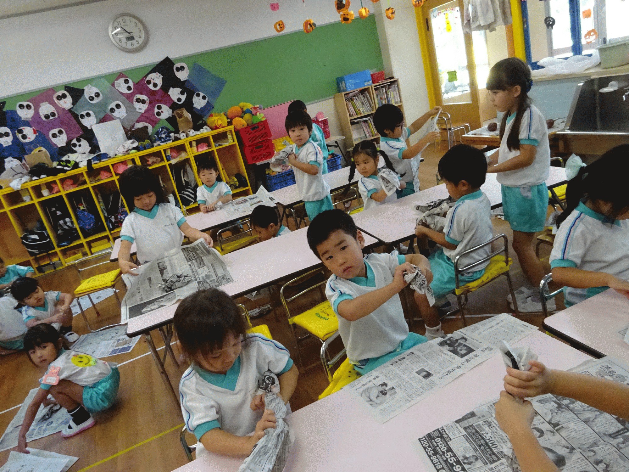 普段机の上での製作でしたが、今回は床に新聞紙を広げてお友達と相談しながら作るようにしたので、楽しんで作っていました。