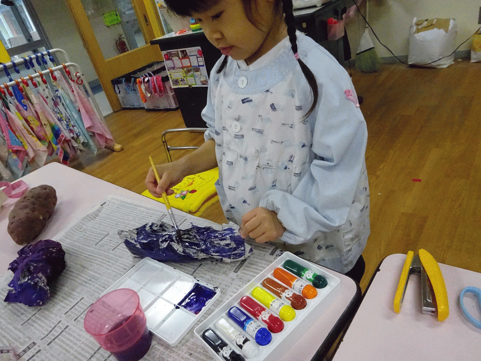 絵の具を使うのは2回目で、今回は混色を行ったので、色を混ぜて色を作る事がとても気に入ったようで『絵の具楽しい〜!もっとやりたい!』と言う声が沢山聞こえてきました。今後、絵の具を使う機会を作って行こうと思います。
