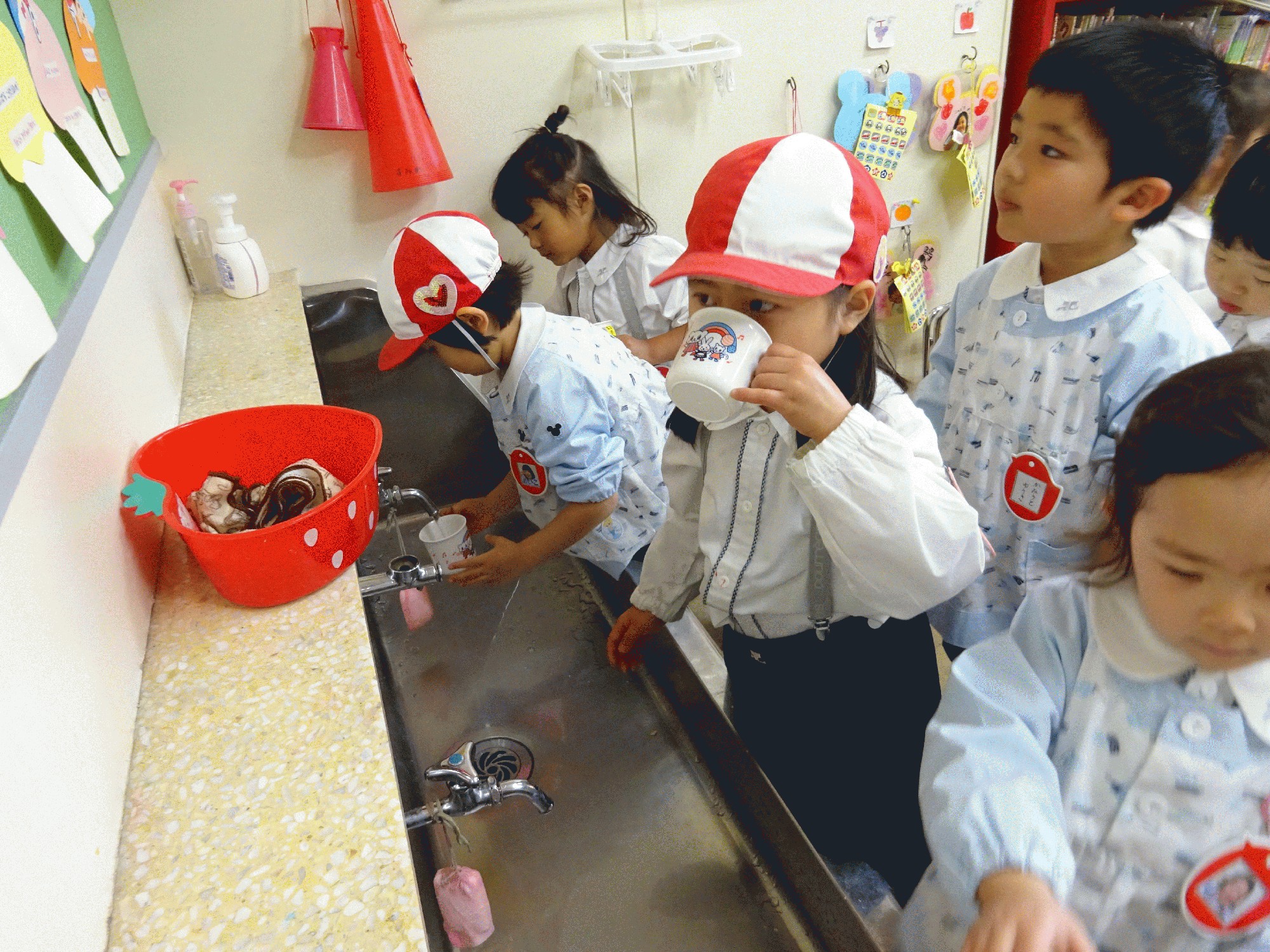 絵本の中での話で手洗いうがいのお話があったので今日からうがいの練習を始めました……!!水道の横に小さな机を用意してそこに給食用のコップを置いて自分のコップでうがいをしています!!