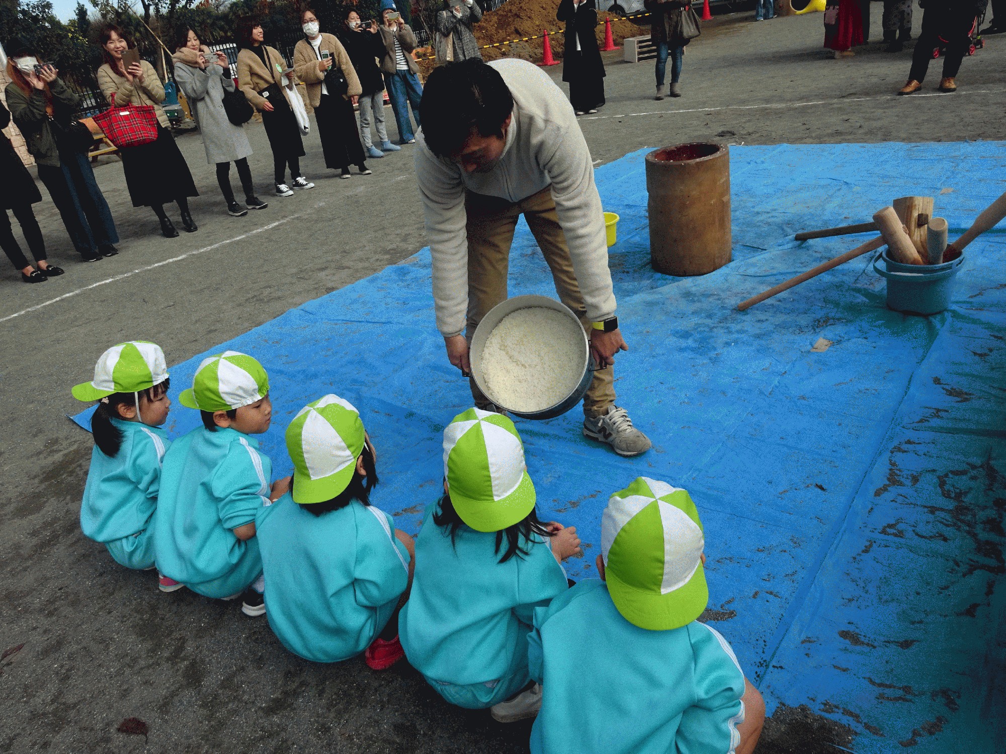 園庭に行き、まずつく前のお米を見て驚く子ども達!!パパ会のパパ達がつくのを興味津々で見ていました!「早くやりたいー!」と嬉しそうに、お友達と協力しながら杵を力一杯ついていました!!最後のパパ達の仕上げでは「がんばれー!」の応援で盛り上がりました!!
