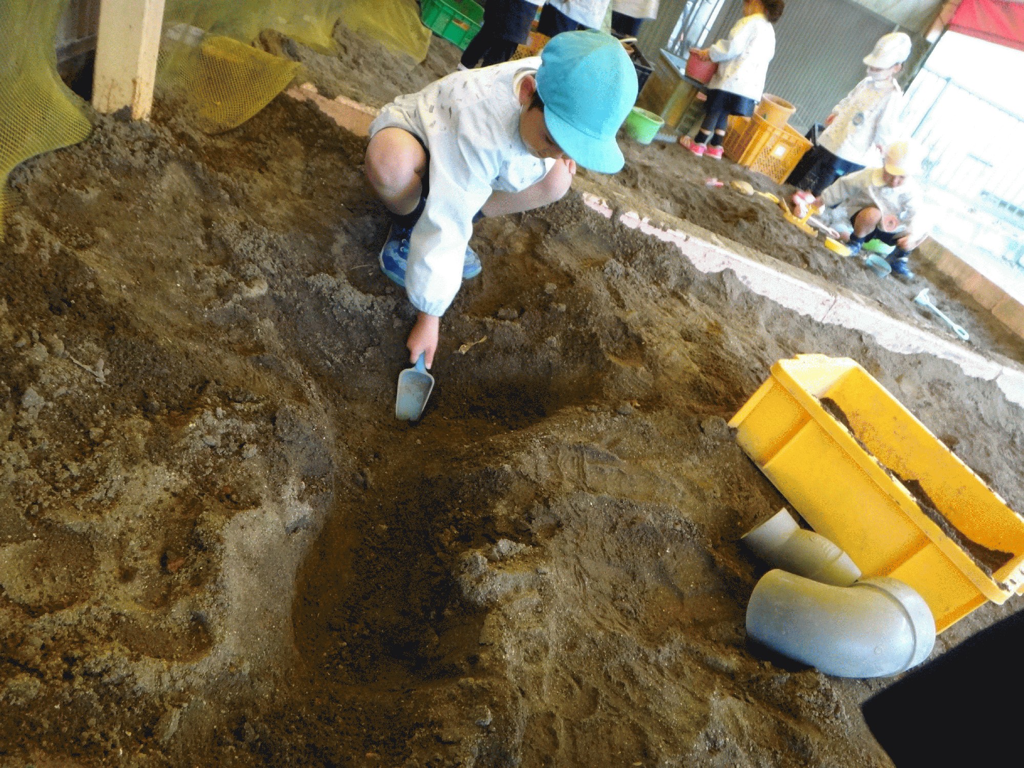 すずらん組の男の子がお友達と穴掘り競争中でした!