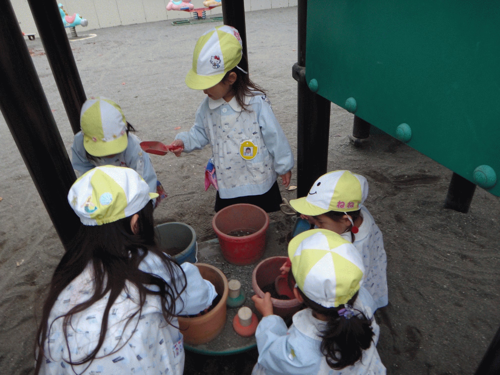 砂が少ない子に自分のバケツから砂を分けてあげる姿も♪