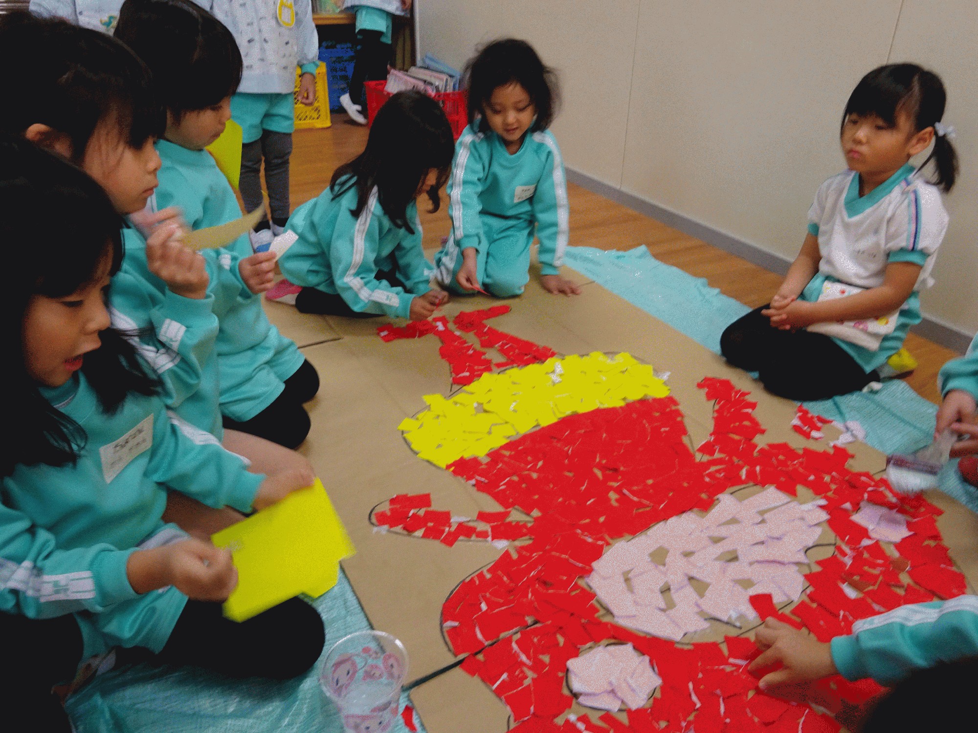 今日は朝から節分に向けての「鬼」作りを年少さんと年中さんで行いました。昨日から鬼作りは行われていて、年長さんは絵の具で鬼を色塗りしていたのですが作業スピードが早く、ものの数十分で完成してしまいました!すごい!写真を見て頂くとお分かりかと思いますが年少さん年中さんは鬼をちぎり絵で表現していて小さな指で器用にペタペタと段ボールに貼り付けて表現しています。みんなで作った愛着のある鬼に豆を投げるのは少し可哀想な気もしますが、、(笑)当日みんながニコニコで豆まき出来ると良いですね!